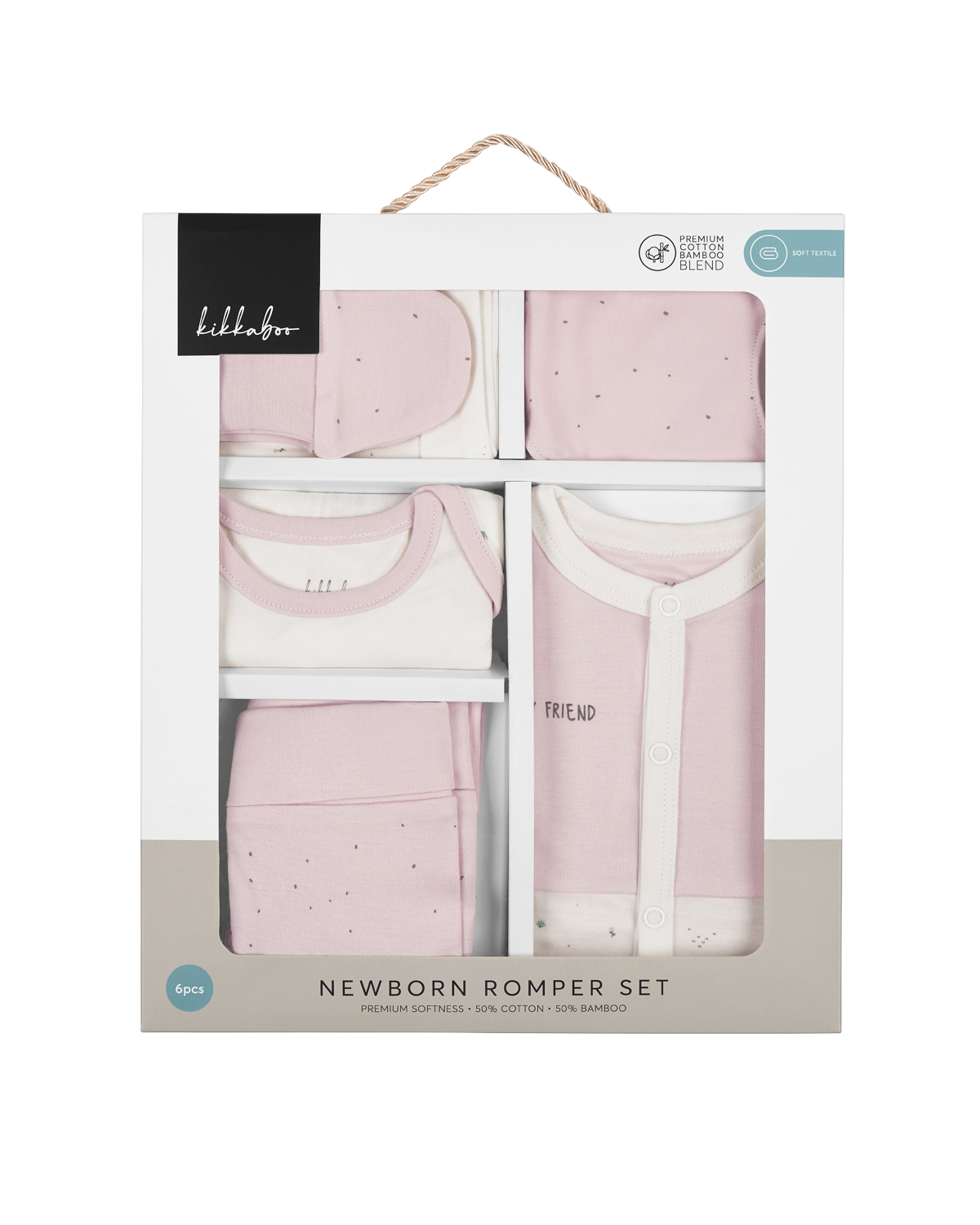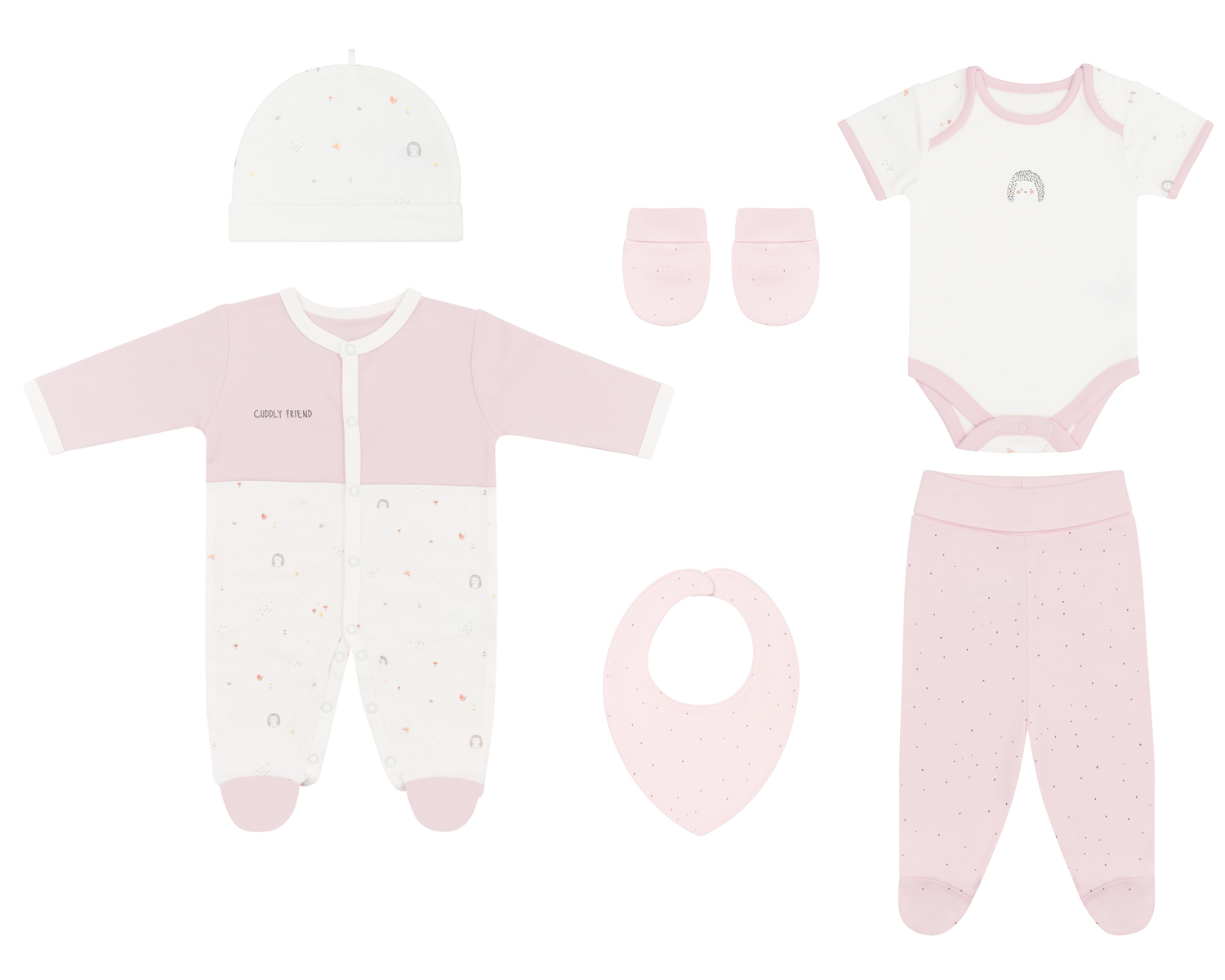 • Мек и нежен комплект за изписване на новородено, изработен от премиум интерлок трико;• Включва необходими дрешки за първите дни на бебето: боди с къс ръкав, гащеризон с дълъг ръкав, ританки, шапка, ръкавици, лигавник;• Дизайнерски принтове в нежни цветове и закачливи детайли;• Лесно закопчаване с тик-так копчета;• Подходящ за бебета 0-3 месеца;• Състав: 50% памук, 50% бамбук;• Луксозна подаръчна кутия. Размери:- Подаръчна кутия: 29x34x3 см / 0.455 кг- Кашон: 62x37x35 см / 12.625 кг / 20 бр/кашон