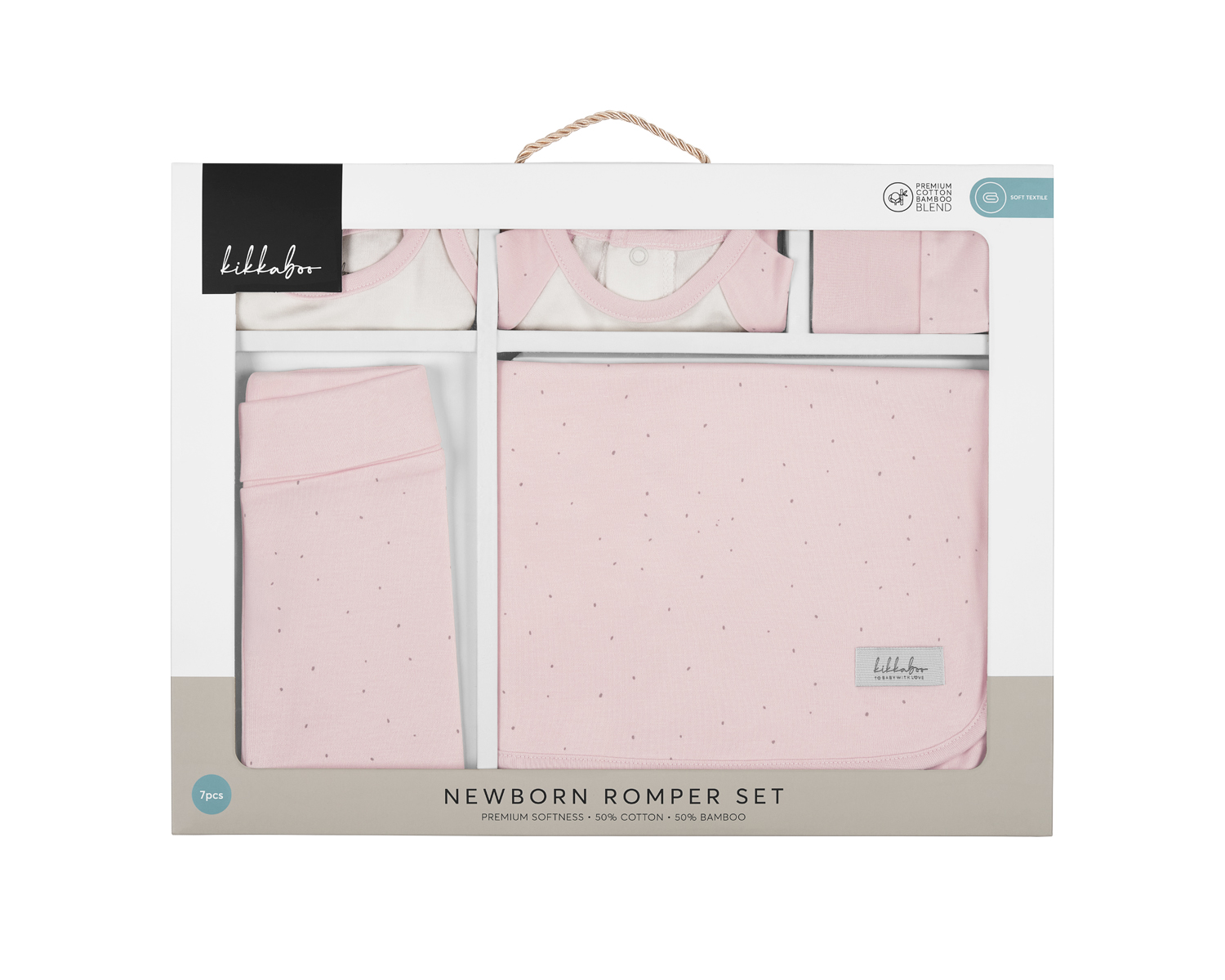 • Мек и нежен комплект за изписване на новородено, изработен от премиум интерлок трико;• Включва необходими дрешки за първите дни на бебето: боди с къс ръкав, блузка с дълъг ръкав, ританки, шапка, ръкавици, лигавник, бебешко двупластово одеяло 85х85см;• Дизайнерски принтове в нежни цветове и закачливи детайли;• Лесно закопчаване с тик-так копчета;• Подходящ за бебета 0-3 месеца;• Състав: 50% памук, 50% бамбук;• Луксозна подаръчна кутия. Размери:- Подаръчна кутия: 43.5x33x3 см / 0.77 кг- Кашон: 46x36x35 см / 25.98 кг / 10 бр/кашон