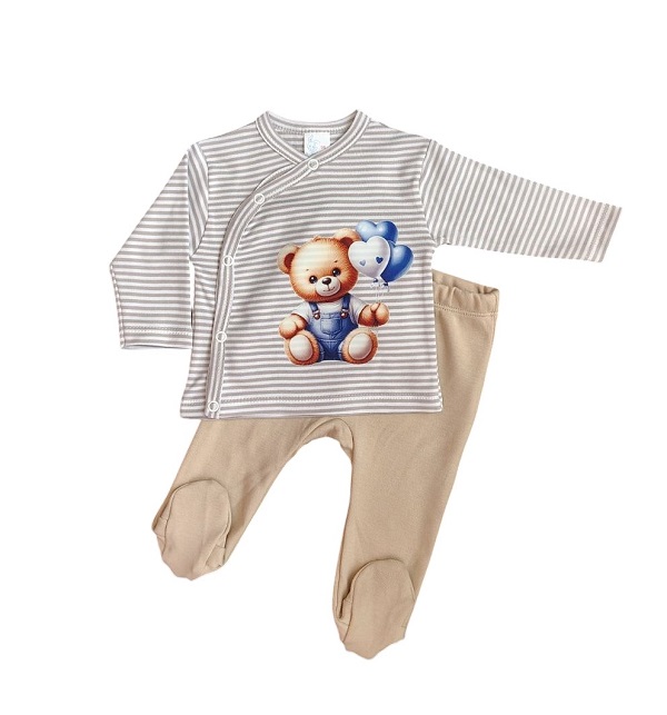 Бебешки комплект с картинка на мече. Жилетка с тик-так копчета и ританки. Изработени са от памучна мека материя – 100% памук. БГ производство.