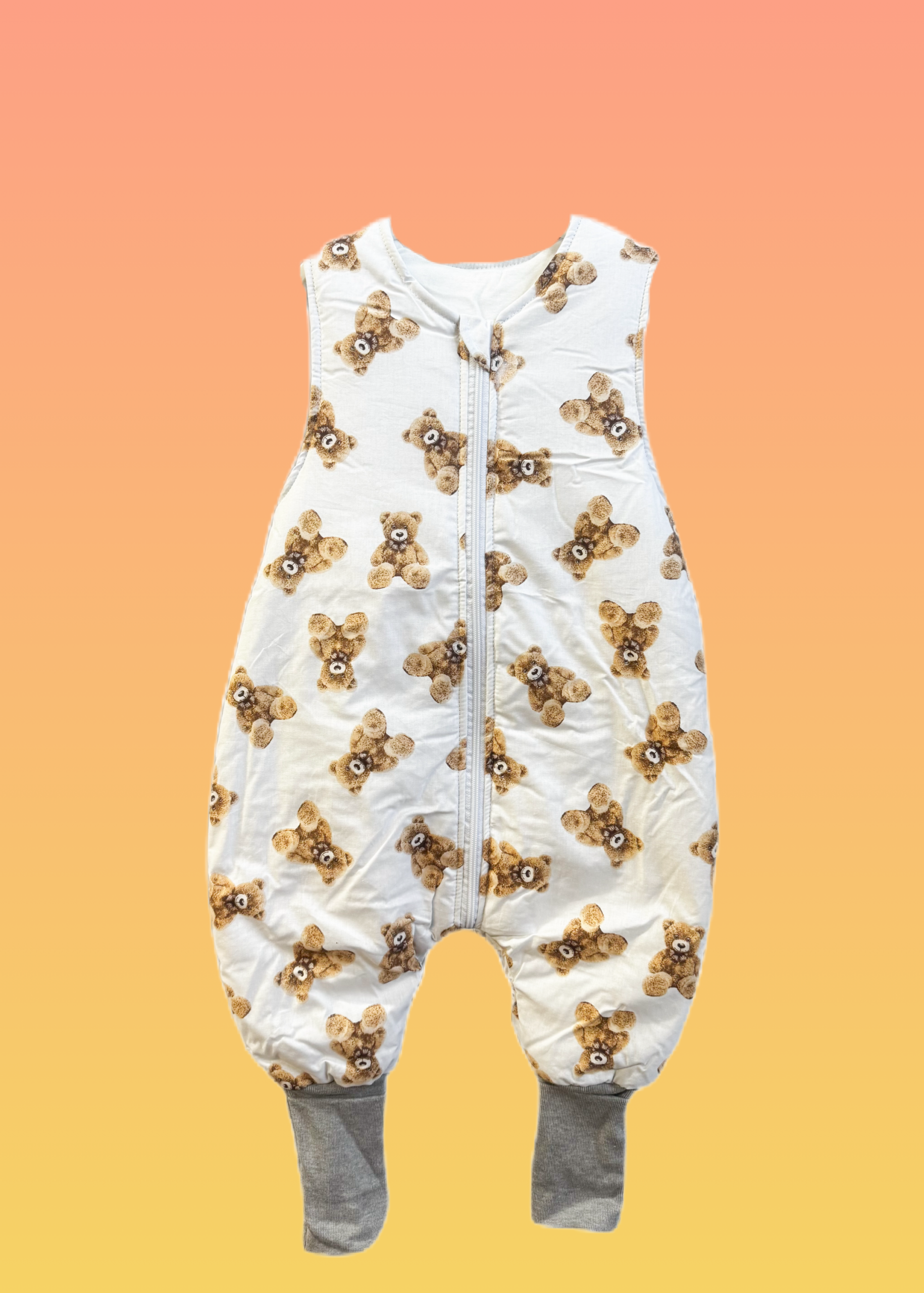 Бебешки спален чувал с крачоли и принт на плюшени мечета. Този тип облекло за сън е алтернатива на традиционните одеяла, като осигурява на бебето безопасност и комфорт, без риск да се отвие през нощта. Позволява свобода на движение, което е идеално за деца, които обичат да ритат или вече ходят. Изработено от мек памук с вата за по-студените месеци. Модела има цип по цялата дължина за лесно обличане и смяна на пелени.