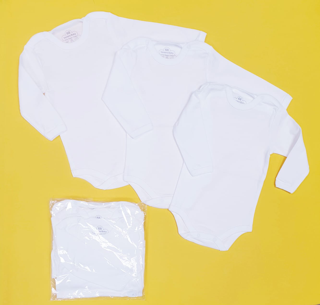 Бяло бебешко боди с дълъг ръкав ВЕНЕРА. Опаковани по 3 бр. в пакет от един размер. Изработени от мек памучен рипс. 100% памук.