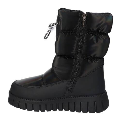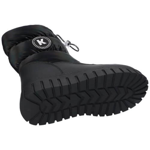 Черни пухкави ботуши за сняг American Club XD172. Те са предназначени за деца или юноши и са идеални за студените зимни дни. Изработени са от издръжлив синтетичен материал и плътен найлонов плат. Цялата вътрешност е изолирана с мека и топла подплата, което гарантира топлинен комфорт. Разполагат със страничен цип за лесно обуване и събуване, както и със стягащ шнур със стопер в горната част за по-добро прилягане. Имат солидна, дебела подметка с дълбок грайфер, която осигурява сцепление и предотвратява подхлъзване. Ботушите са с кръгло бомбе и логото „K“ на марката, отпечатано в бял кръг отстрани.