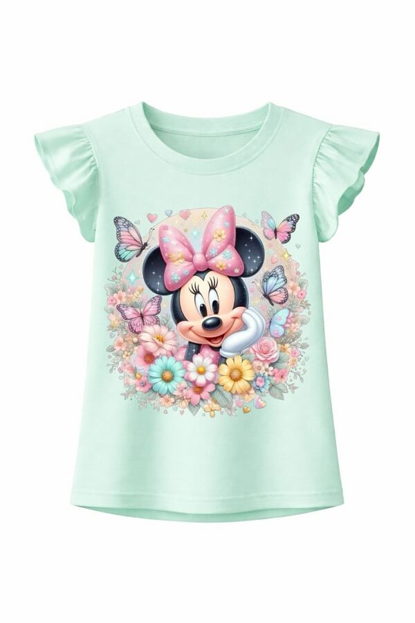 Очарователна и стилна детска тениска с любимата Мини Маус, украсена с нежни цветя и пеперуди. Моделът е в мек кремав нюанс и е допълнен с красиви къдрички на ръкавите, които придават елегантен и игрив вид.