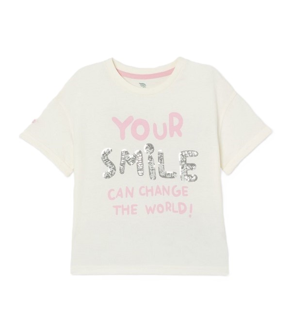 Стилна и вдъхновяваща детска тениска в нежен кремав цвят, създадена да носи усмивки и настроение. Моделът е украсен с красиво послание “Your Smile Can Change the World”, като думата “SMILE” е подчертана с блестящ ефект от пайети за допълнителен акцент.