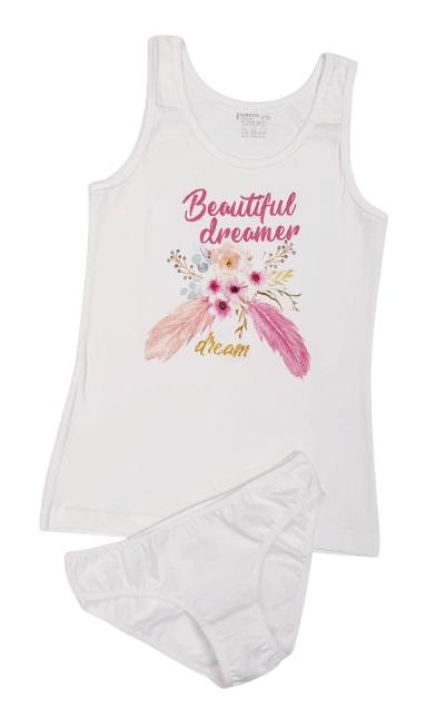 Детски комплект бельо за момиче Beautiful dreamer, състоящ се от потник с широка презрамка и бикини. Комплектът е в цвят екрю и включва цветна щампа с надпис „Beautiful dreamer“ и декорация от цветя и пера.