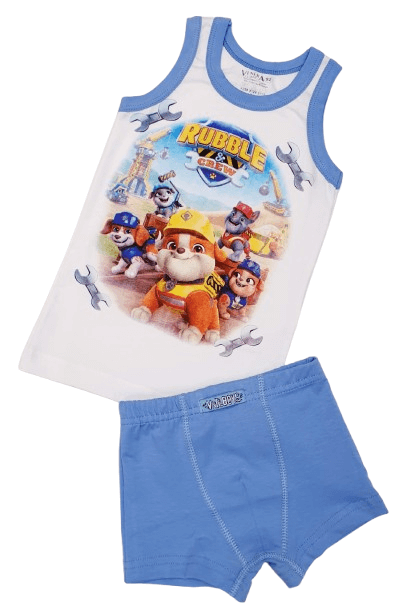Комплект детско бельо Paw Patrol Венера, включва потник с боксер с героите от Paw Patrol (Пес Патрул). Конкретният дизайн е вдъхновен от серията „Rubble & Crew“ (Бандата на Рабъл).
