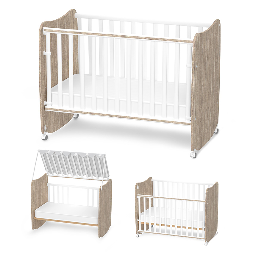 Бебешко легло-люлка,Произведено от ламинирано ПДЧ 18 мм от най-висок клас,Стабилни метални сглобки за лесен и бърз монтаж,Две нива на подматрачната рамка,Предвидено за матрак 120 х 60 см (височина макс. 12 см). Матрака не е включен в комплекта,PVC асансьорна решетка с две нива с автоматично застопоряване в горно и в долно положение, и неподвижна (стационарна) решетка,Отстраняеми предни ламели,Ниска преградна решетка с възможност за монтаж отляво или отдясно,Детско легло-къщичка,Многопозиционен покрив,Текстилен сенник с вградени вързалки за сигурно закрепване,Отговаря на европейския стандарт за безопасност БДС EN 716-1:2017+AC:2019,Многофункционални колела със силиконови пръстени///