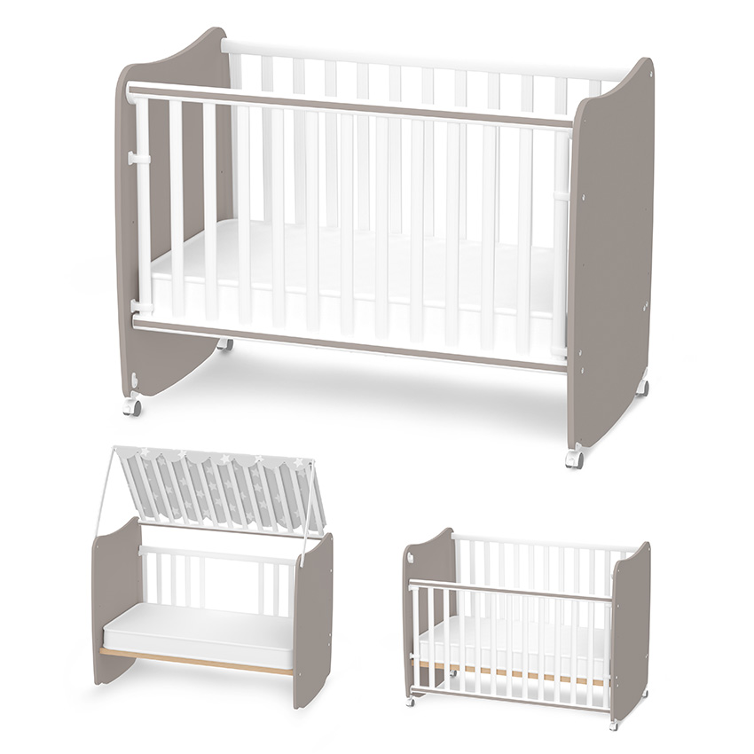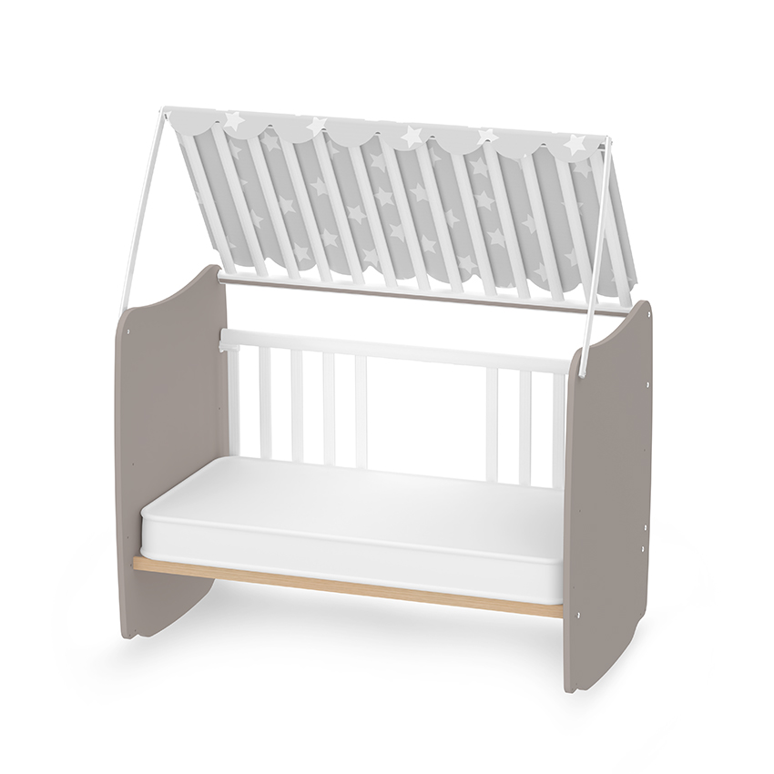 Бебешко легло-люлка,Произведено от ламинирано ПДЧ 18 мм от най-висок клас,Стабилни метални сглобки за лесен и бърз монтаж,Две нива на подматрачната рамка,Предвидено за матрак 120 х 60 см (височина макс. 12 см). Матрака не е включен в комплекта,PVC асансьорна решетка с две нива с автоматично застопоряване в горно и в долно положение, и неподвижна (стационарна) решетка,Отстраняеми предни ламели,Ниска преградна решетка с възможност за монтаж отляво или отдясно,Детско легло-къщичка,Многопозиционен покрив,Текстилен сенник с вградени вързалки за сигурно закрепване,Отговаря на европейския стандарт за безопасност БДС EN 716-1:2017+AC:2019,Многофункционални колела със силиконови пръстени///