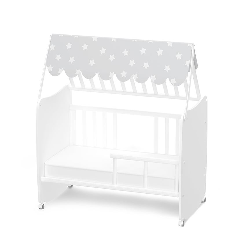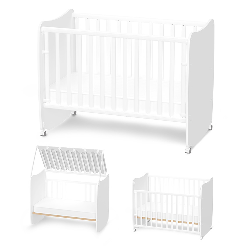 Бебешко легло-люлка,Произведено от ламинирано ПДЧ 18 мм от най-висок клас,Стабилни метални сглобки за лесен и бърз монтаж,Две нива на подматрачната рамка,Предвидено за матрак 120 х 60 см (височина макс. 12 см). Матрака не е включен в комплекта,PVC асансьорна решетка с две нива с автоматично застопоряване в горно и в долно положение, и неподвижна (стационарна) решетка,Отстраняеми предни ламели,Ниска преградна решетка с възможност за монтаж отляво или отдясно,Детско легло-къщичка,Многопозиционен покрив,Текстилен сенник с вградени вързалки за сигурно закрепване,Отговаря на европейския стандарт за безопасност БДС EN 716-1:2017+AC:2019,Многофункционални колела със силиконови пръстени///