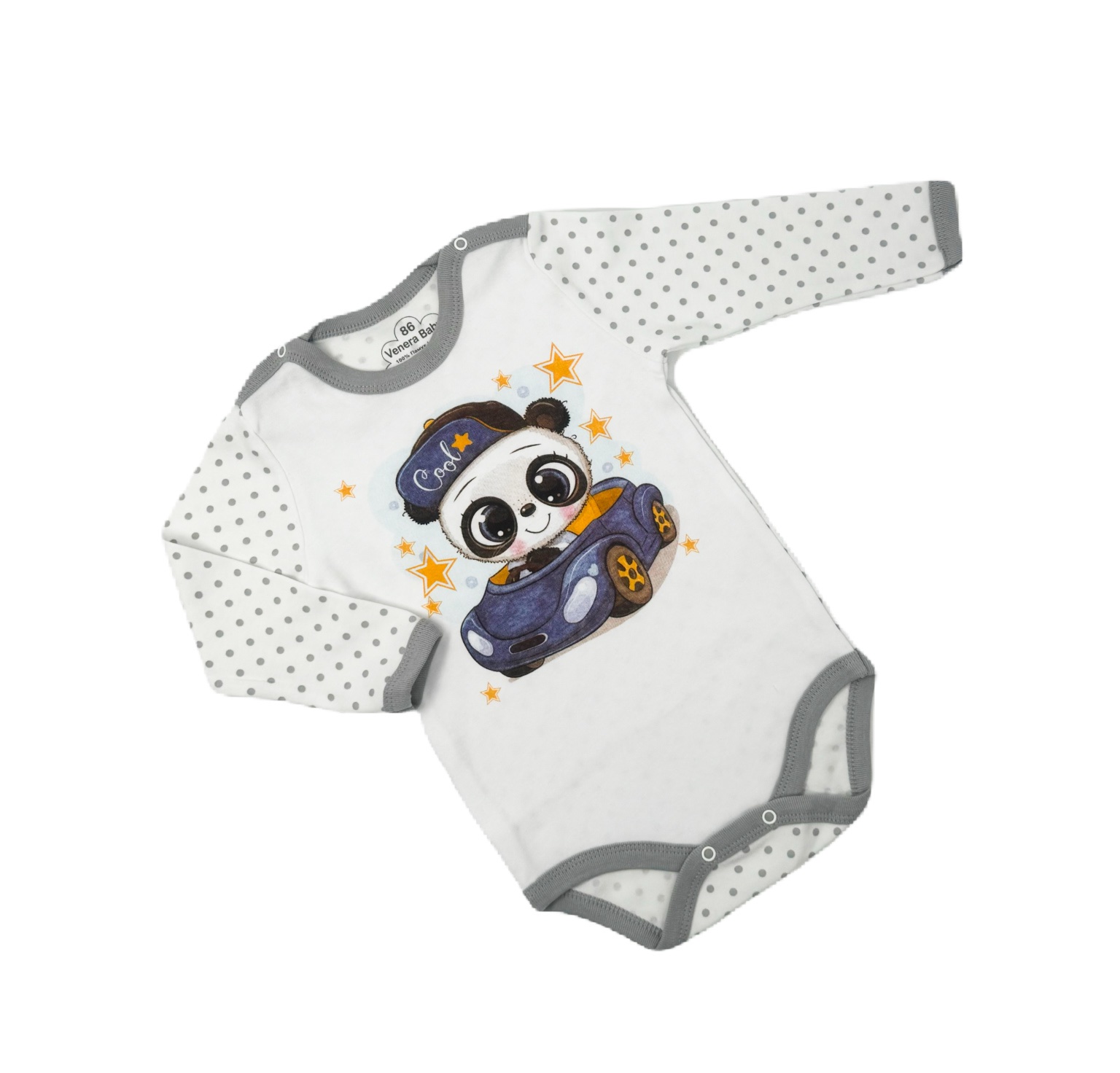 Боди с дълъг ръкав, изработено от интерлог. С детски картинки и точки.