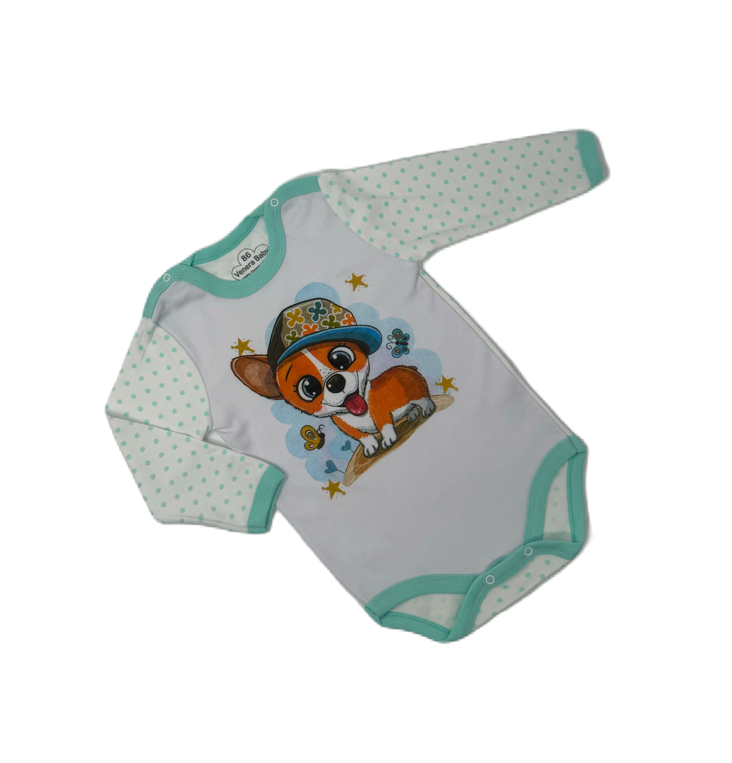 Боди с дълъг ръкав, изработено от интерлог. С детски картинки и точки.