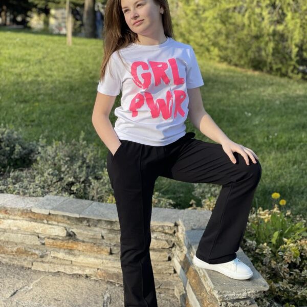 Бяла тениска с черен надпис и цветни пръски MACKAYS
