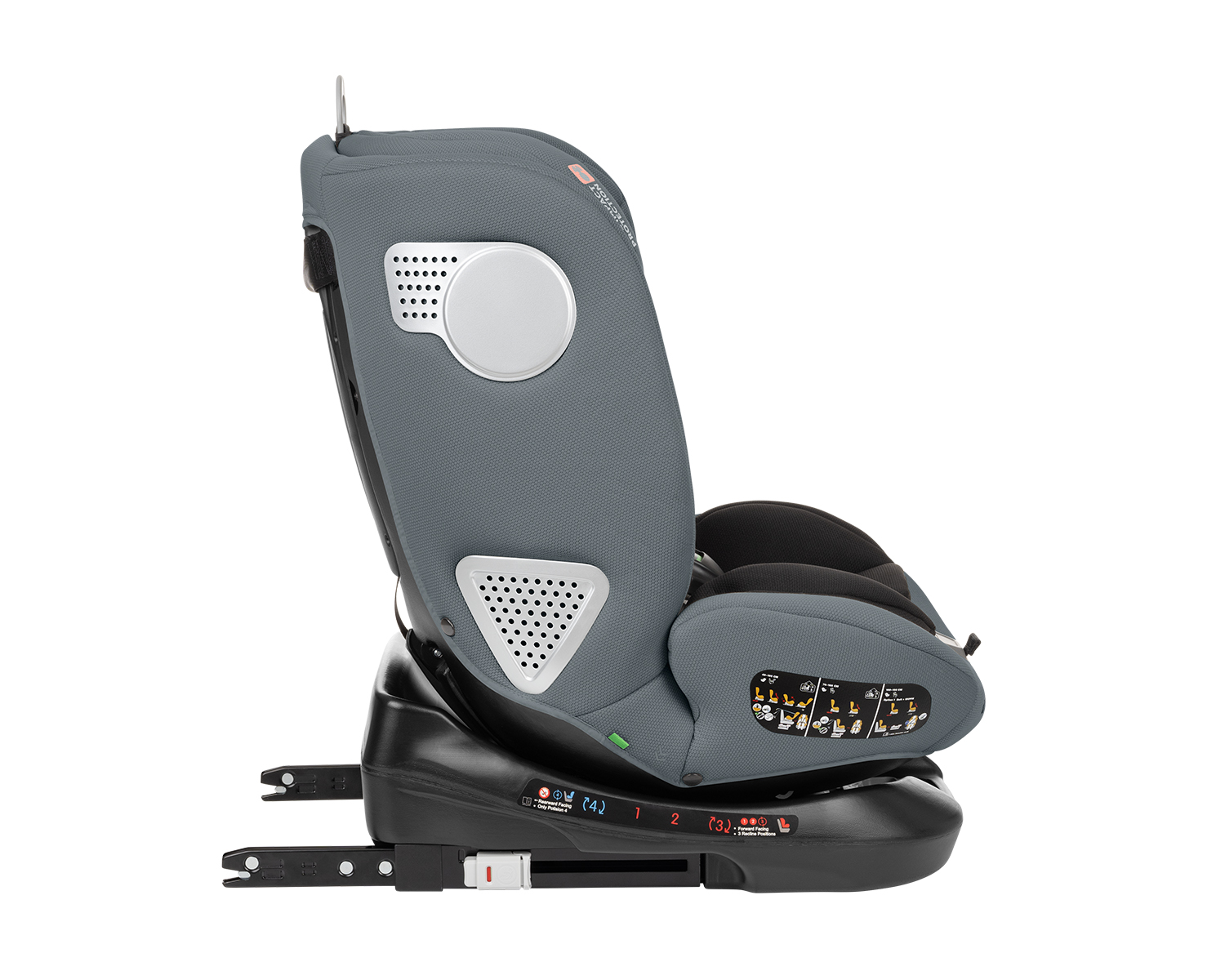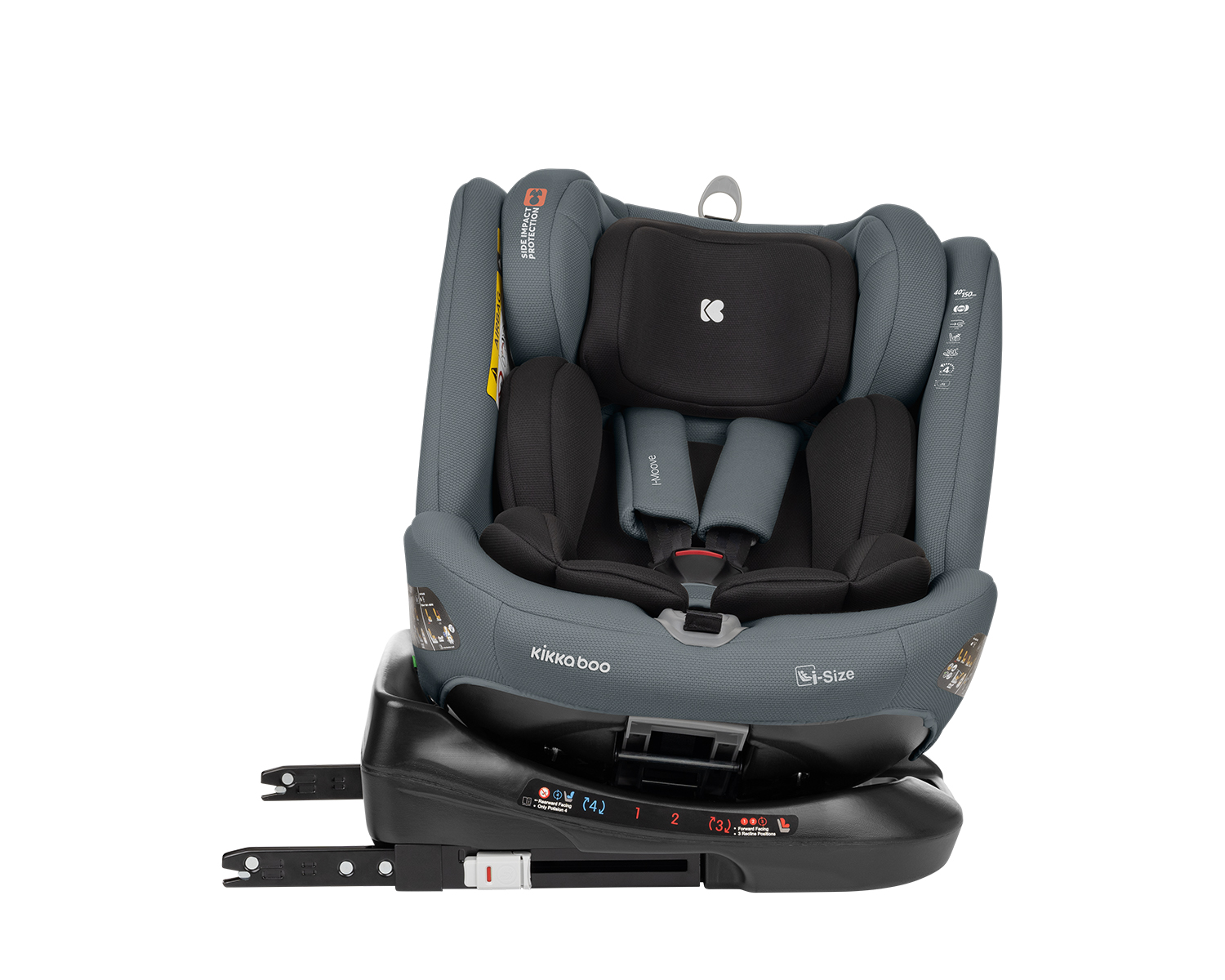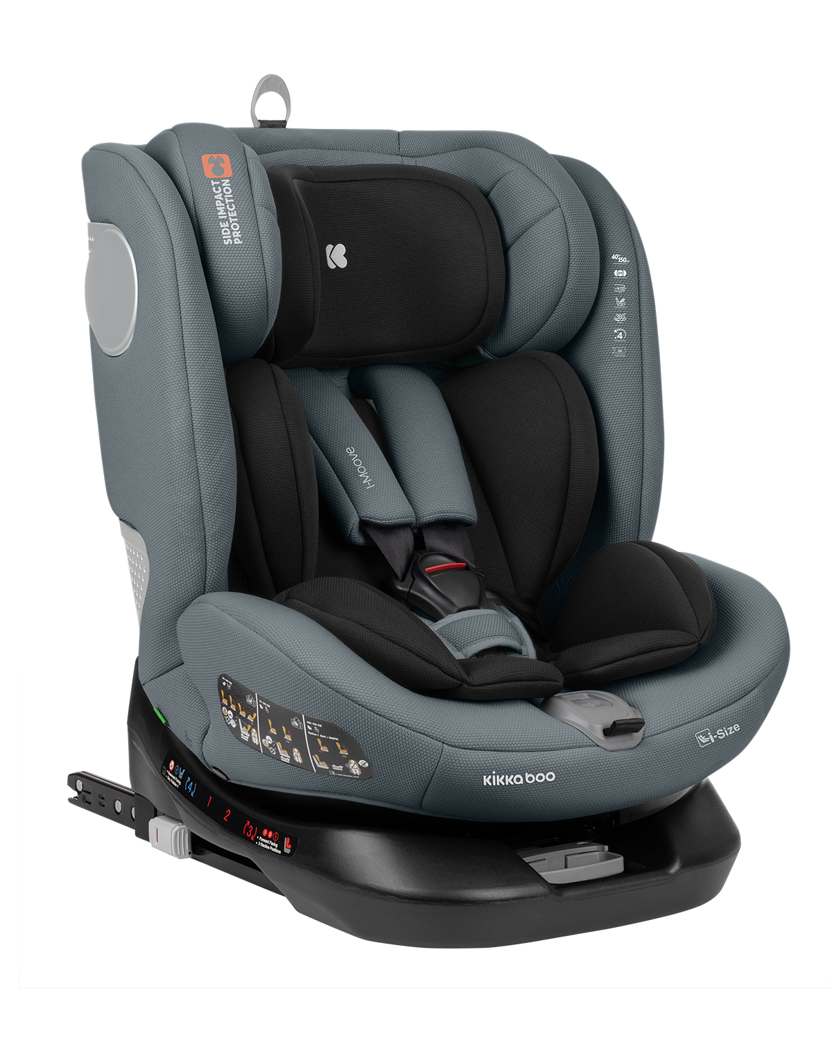 • i-SIZE (40-150 cм);• Подходящо за използване в посока обратна на движението от 40 до 105 см;• Подходящо за използване по посока на движението от 76 до 150 см;• Регулируем наклон на седалката в 3 позиции в посока на движението и 1 позиция в посока обратна на движението;• 360 градуса въртене на седалката;• ISOFIX система за допълнителна сигурност и лесно захващане към седалката на автомобила;• Top tether (горна лента) за допълнитена сигурност;• SPS – система за защита от страничен удар;• Регулируема облегалка за глава в 13 позиции;• 5-точков предпазен колан с меки раменни подложки и покритие на долната катарама;• Регулатор на коланите;• Мека и удобна възглавничка за по-голям комфорт;• Мемори пяна на подложката за глава. Тествано в съответствие с Регламент за изпитване ECE R129/03 от ATS San Marino. Размери:- Продукт: 48x47x59-83 cм / 12.2 кг- Кашон: 51x46x61 cм / 14 кг / 1 бр/кашон