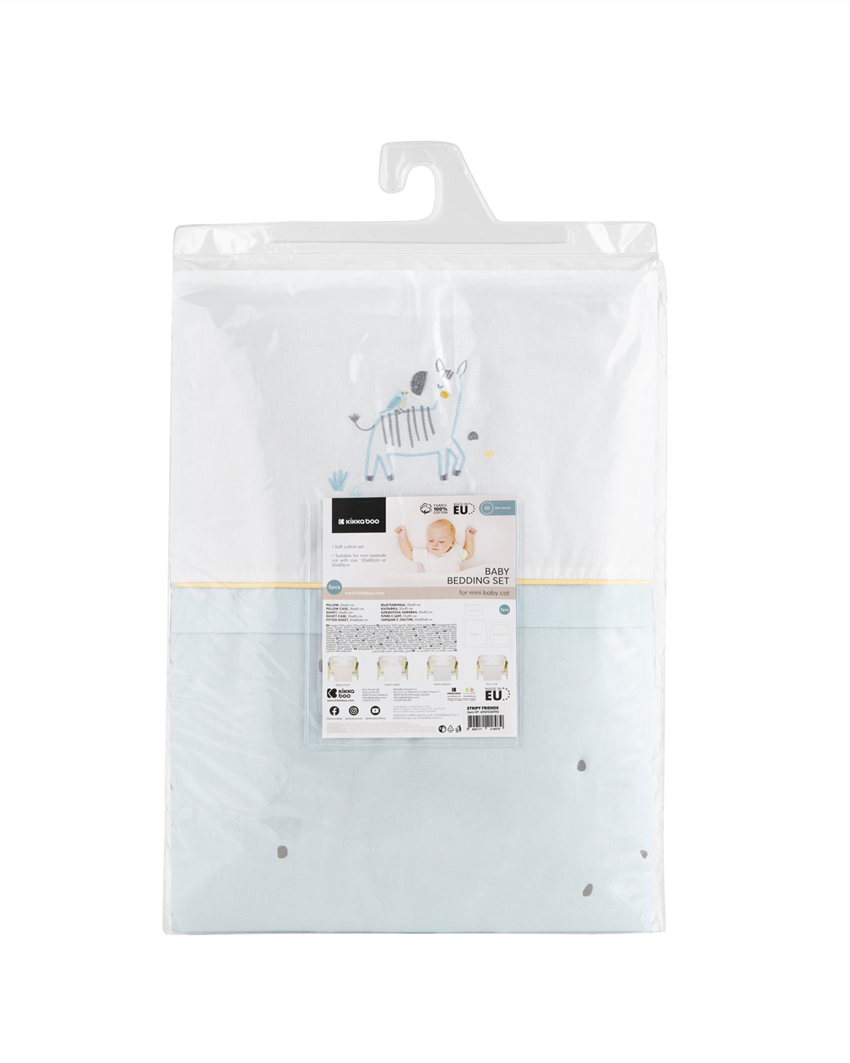 • Мек и нежен бебешки спален комплект, изработен от 100% висококачествен памук ранфорс;• Сертифицирани по OEKO-TEX материи;• Закачлив дизайнерски десен в нежни цветове и луксозна бродерия;• Подходящ за бебешка мини кошара с размер 50×85 см или 50х80 см;• Комплектът включва:- Калъфка 35×45 см със странично отваряне тип плик;- Мека памучна възглавница 35×45 см;- Долен чаршаф с ластик 50x80x8 см;- Плик за олекотена завивка с цип 85х55 см;- Мека и топла олекотена завивка 85х55 см, изработена от пухкава полиестерна вата и нетъкан текстил;• Предлага се в прахоустойчива опаковка за лесно пренасяне и съхранение;• Произведено в България. Размери:- Прахоустойчива опаковка: 35x53x10 см / 0.52 кг- Кашон: 82x45x70 см / 17.4 кг / 30 бр/кашон