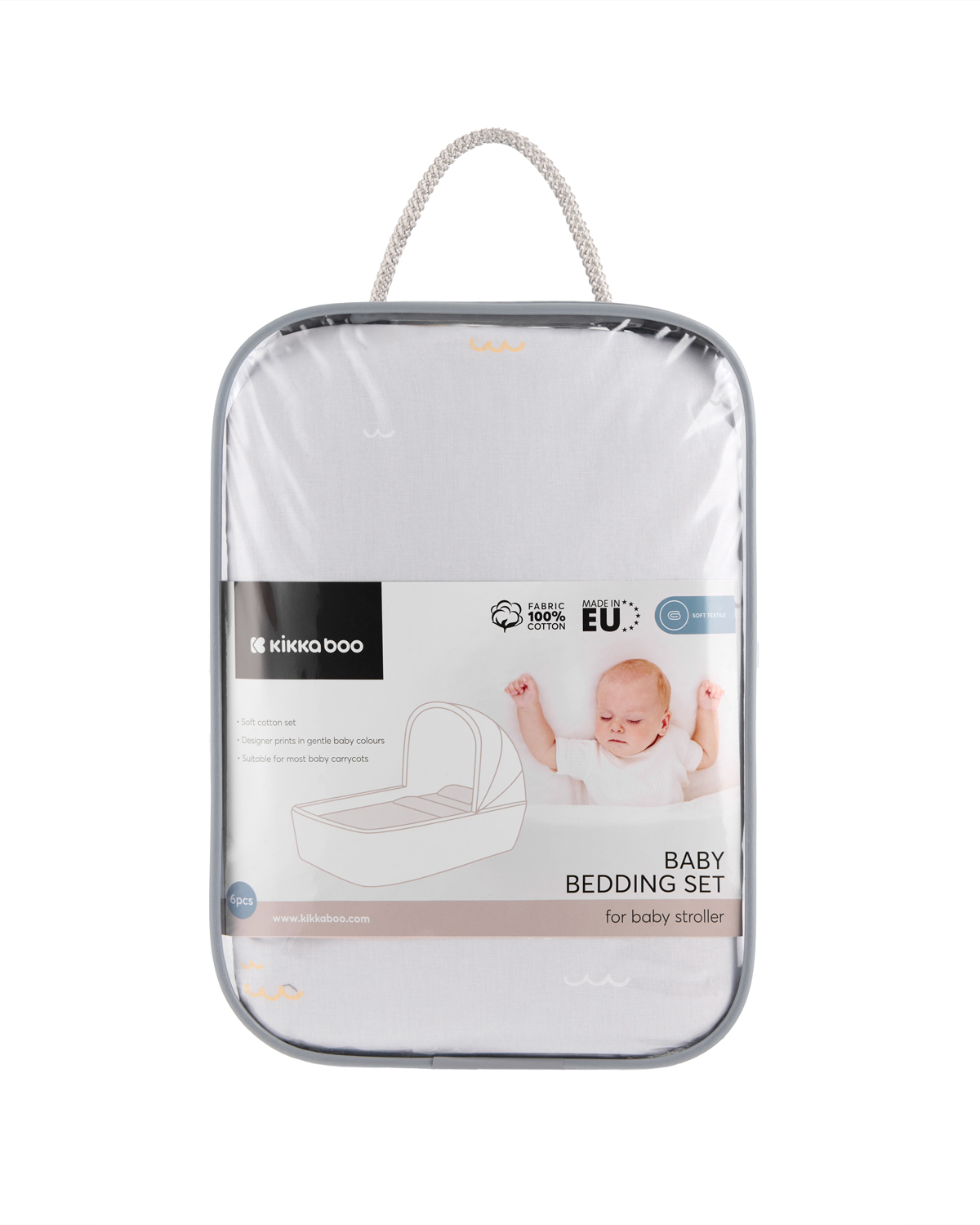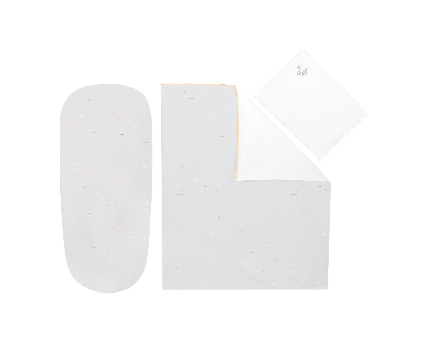 • Мек и нежен бебешки спален комплект, изработен от 100% висококачествен памук ранфорс;• Сертифицирани по OEKO-TEX материи;• Закачлив дизайнерски десен в нежни цветове и луксозна бродерия;• Подходящ за стандартно кошче за новородено;• Комплектът включва:- Калъфка 35×26 см със странично отваряне тип плик;- Мека памучна възглавница 35×26 см;- Долен чаршаф с ластик 40x80x5 см;- Плик за олекотена завивка с цип 80×60 см;- Мека и топла олекотена завивка 80×60 см, изработена от пухкава полиестерна вата и нетъкан текстил;- Непромокаем протектор за матрак на кошче с лесно ластично закрепяне 38х78 см;• Предлага се в прахоустойчива чанта за лесно пренасяне и съхранение;• Произведено в България. Размери:- Прахоустойчива чанта: 34x24x8 см / 0.59 кг- Кашон: 82x45x70 см / 23.2 кг / 36 бр/кашон