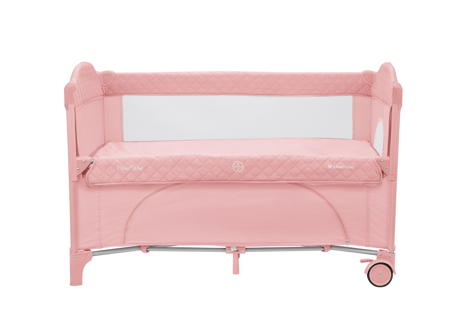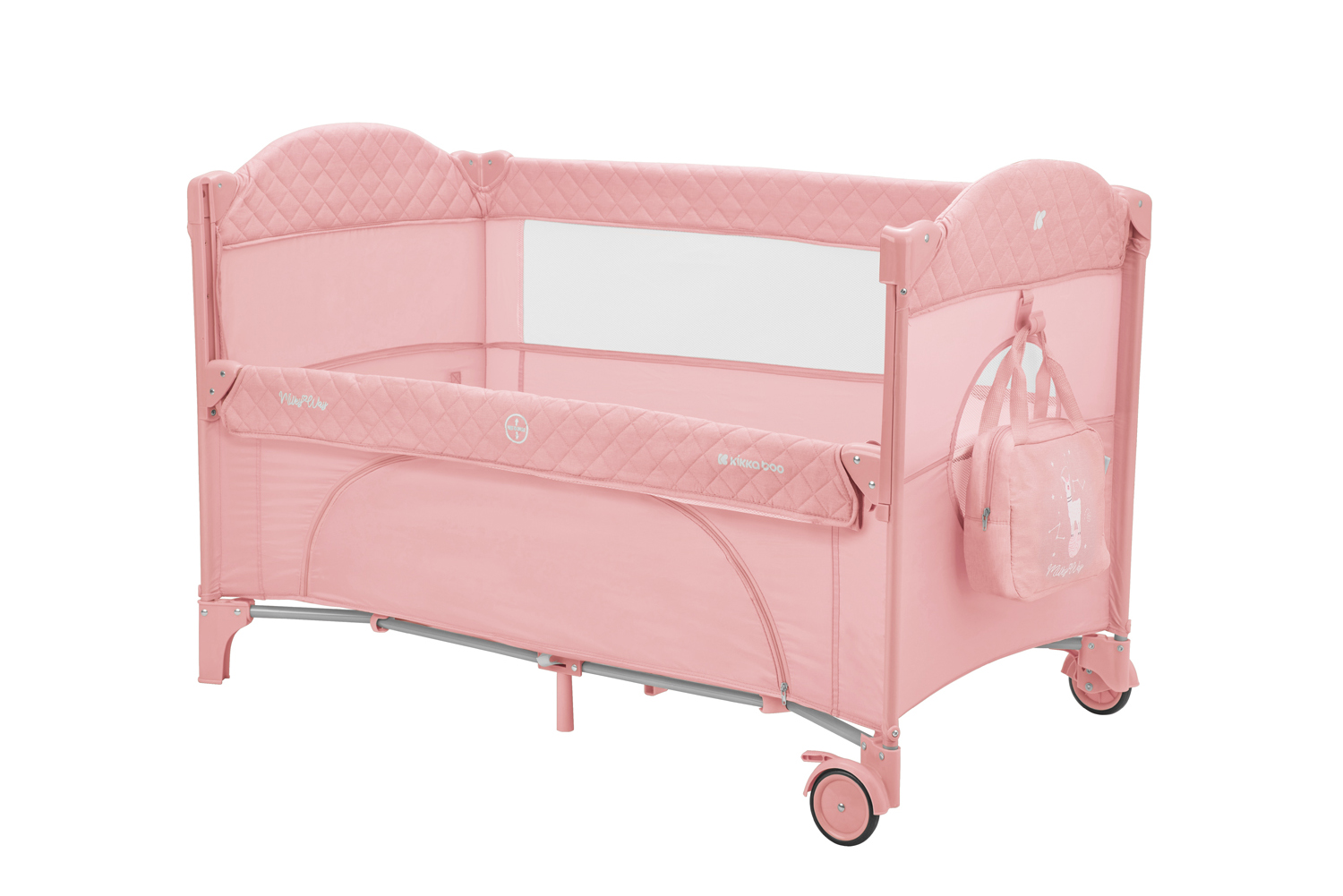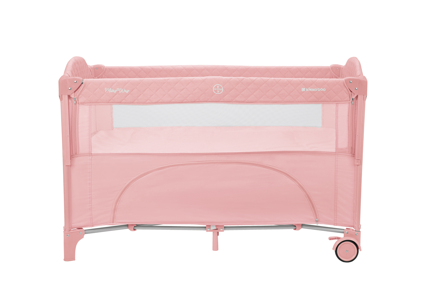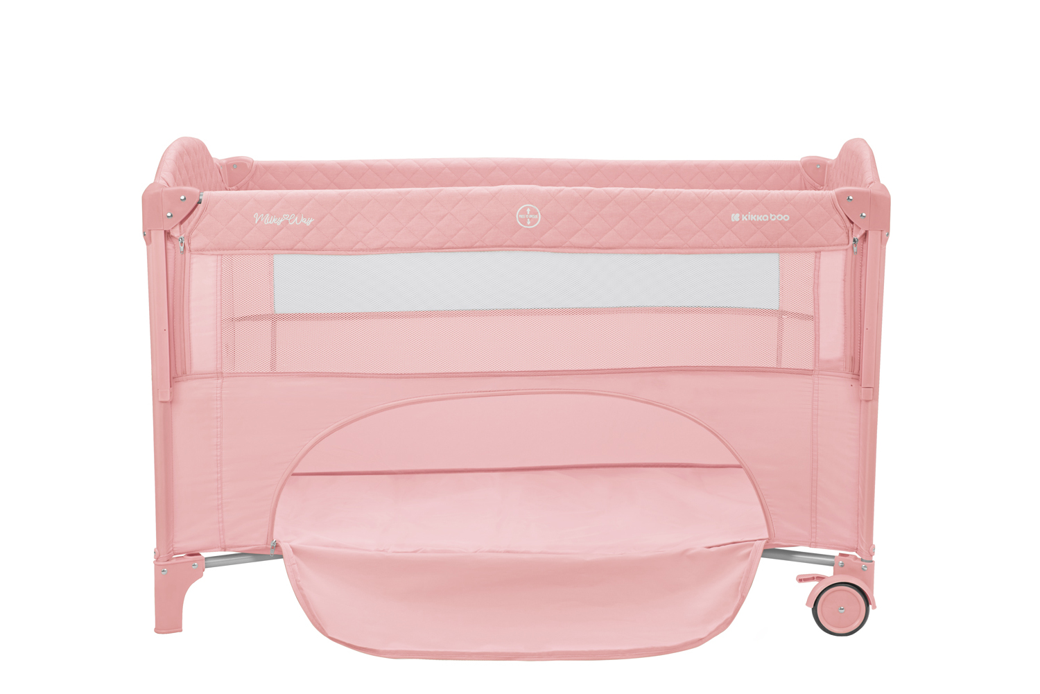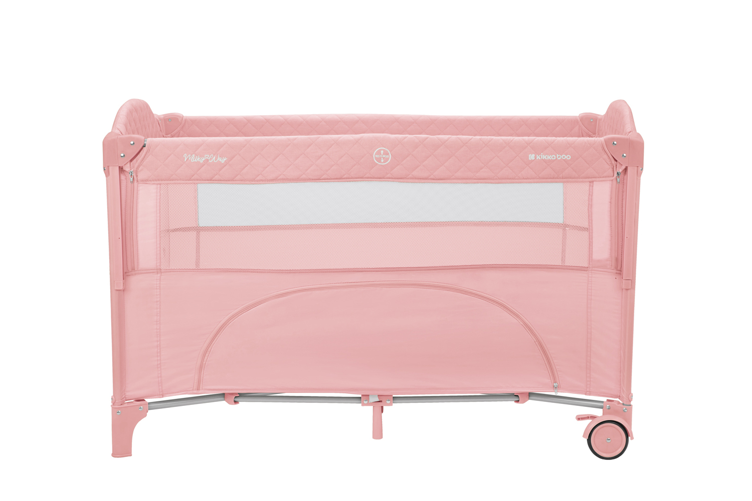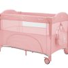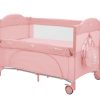 Второ ниво:• Подходящо от раждане до 6 месеца, с тегло до 9кг; Първо ниво: • Подходящо за деца от 6 до 36 месеца, с тегло до 15кг; • Падаща страница;• Мрежести части за по-добра вентилация;• Допълнителна лента за фиксиране на кошарата към леглото на родителите;• Преден отвор с цип;• Мека подложка; • 2 колела със спирачки за лесно преместване;• Чанта за принадлежности. Размери:- Продукт: 71x125x84 см / 8.8 кг- Кашон: 77.7x21x21 см / 9.1 кг / 1 бр/кашон