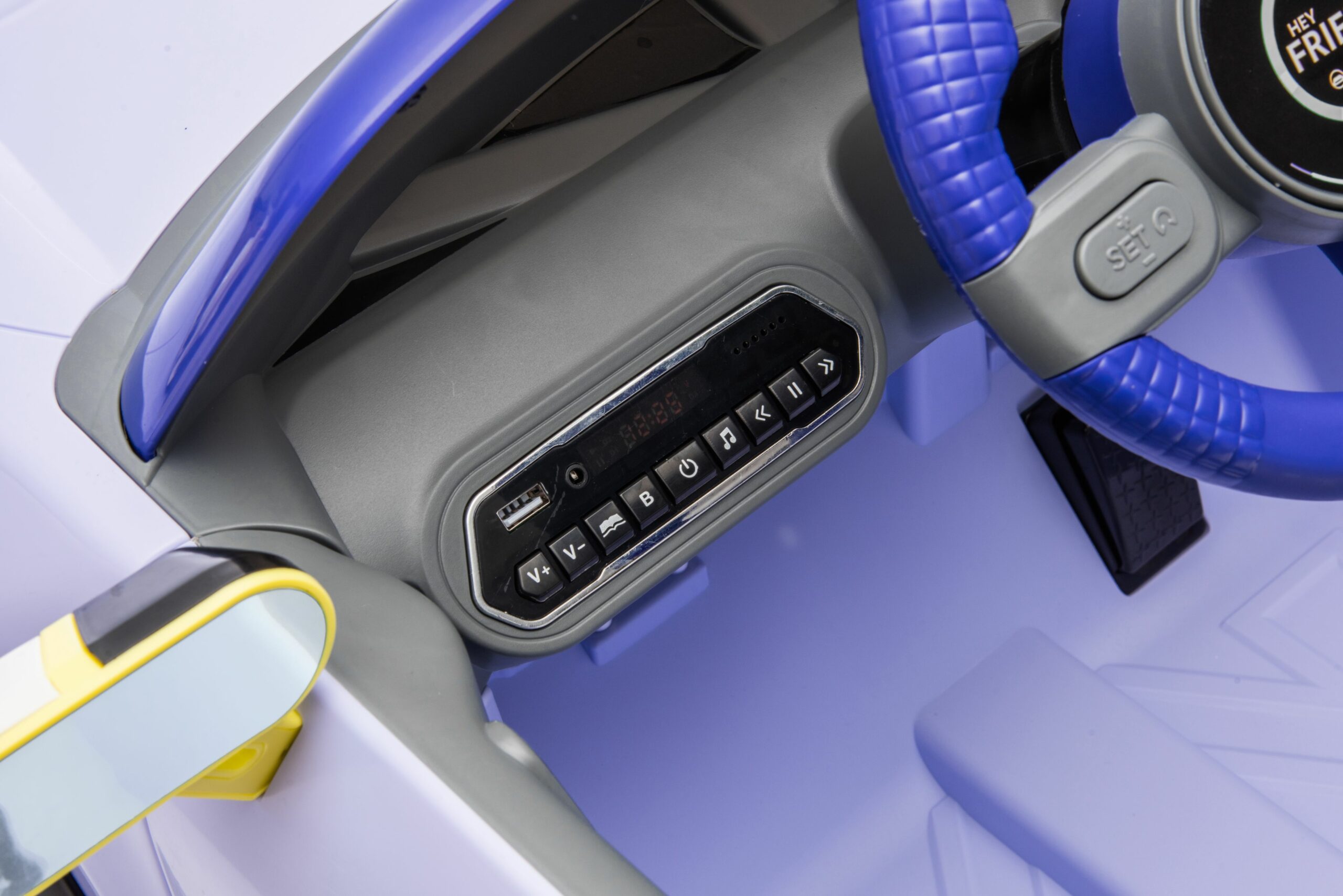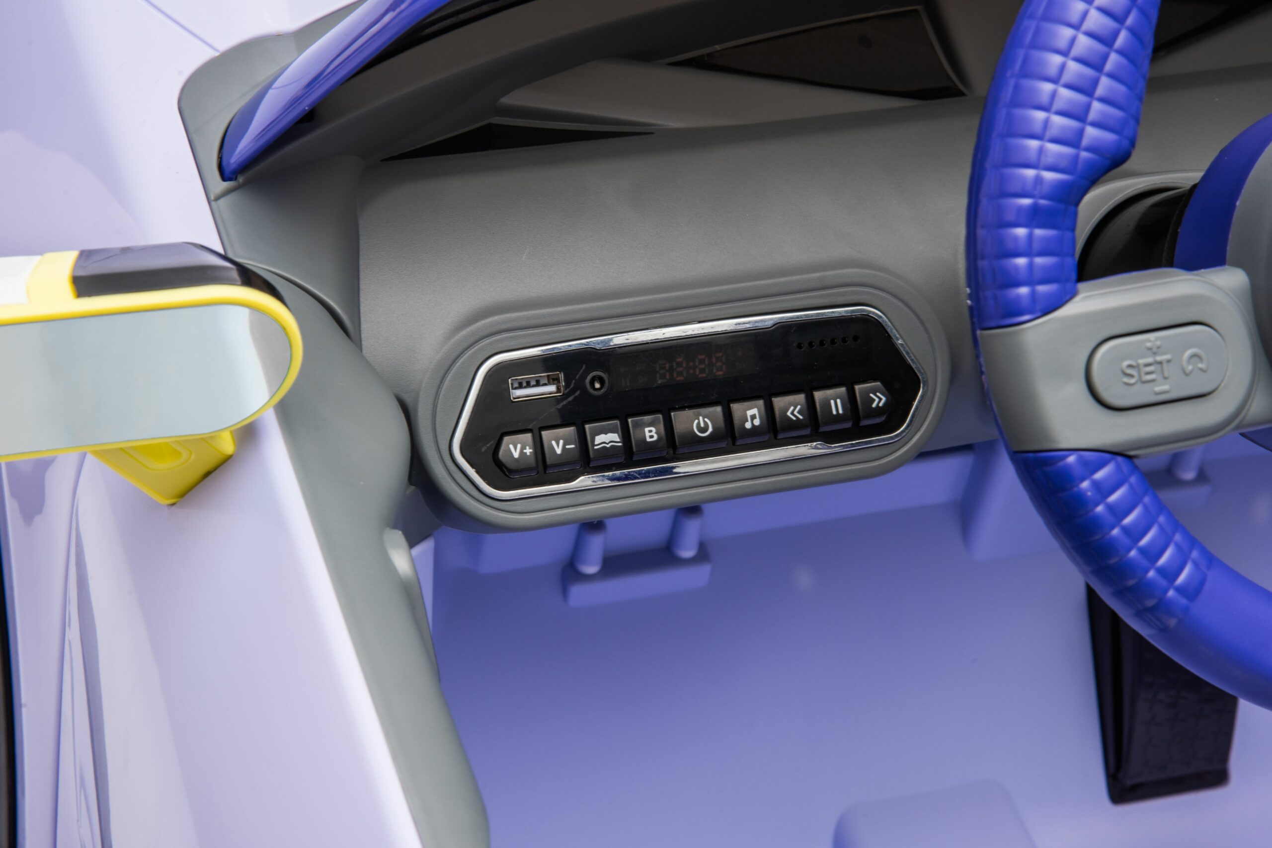 • Батерия 24V5AH*1;• Мотор 390#*4;• Дистанционно управление – 2.4G;• Кожена седалка;• EVA Гуми;• Предни и задни светлини;• Волан със звук;• Задно окачване;• Две отварящи се врати;• Музика, MP3, USB, приказки, Bluetooth, регулиране на звука, индикатор за захранване;• 3-точков предпазен колан. Размери:- Продукт: 108x63x48 см- Кашон: 110x58x32 см- CBM: 0.204