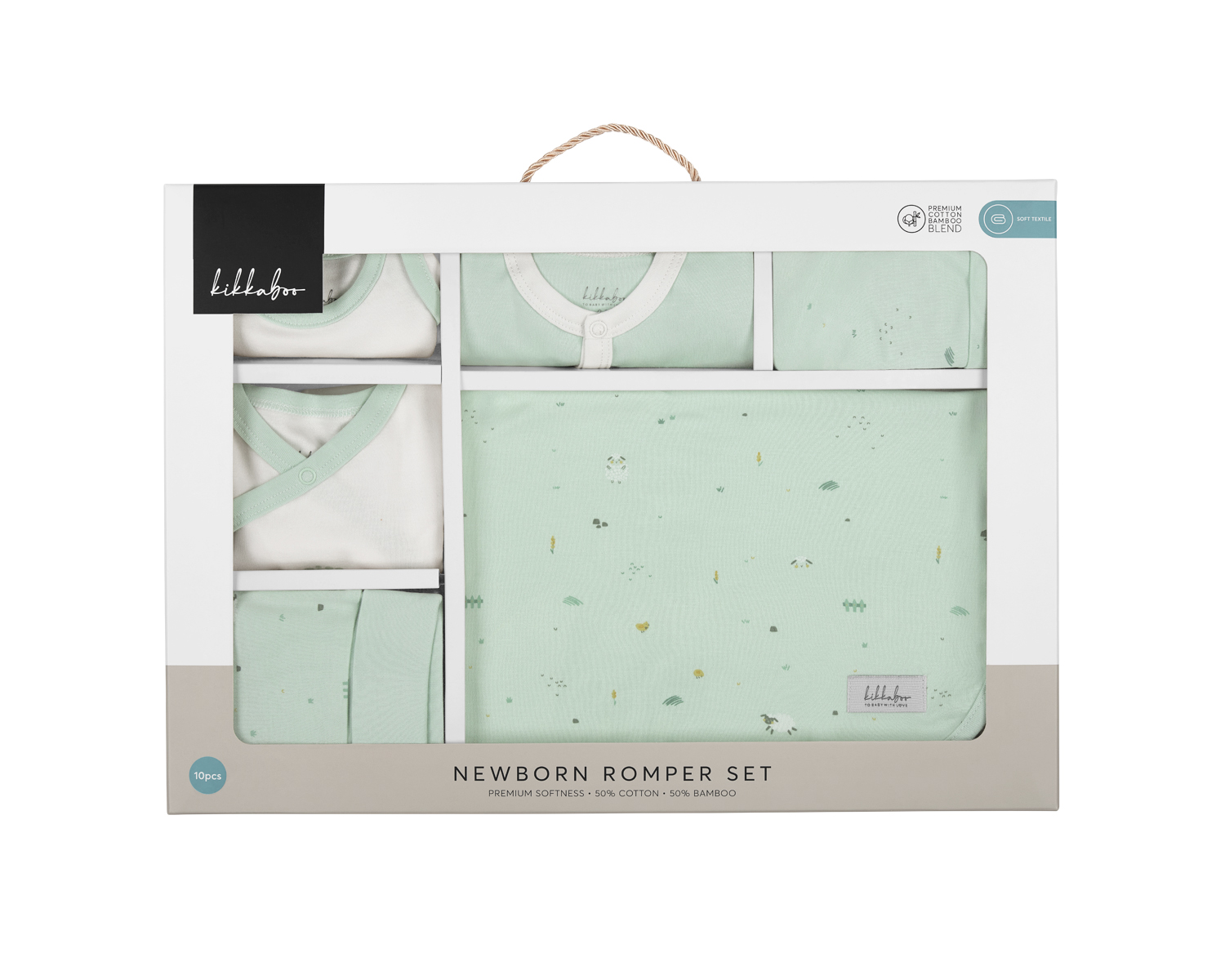 • Мек и нежен комплект за изписване на новородено, изработен от премиум интерлок трико;• Включва необходими дрешки за първите дни на бебето: боди с къс ръкав, боди с дълъг ръкав, блузка с дълъг ръкав, гащеризон с дълъг ръкав, ританки, шапка, ръкавици, лигавник, кърпичка 50х25см, бебешко двупластово одеяло 85х85см;• Дизайнерски принтове в нежни цветове и закачливи детайли;• Лесно закопчаване с тик-так копчета;• Подходящ за бебета 0-3 месеца;• Състав: 50% памук, 50% бамбук;• Луксозна подаръчна кутия. Размери:- Подаръчна кутия: 43.5x33x3 см / 0.77 кг- Кашон: 46x36x35 см / 25.98 кг / 10 бр/кашон