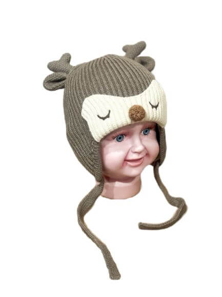 Бебешка плетена шапка с еленче в три цвята – бежов, сив, екрю, проектирана да изглежда като еленче. Шапката е изработена от плетен материал, има малки рога и ушички, както и избродирано лице на елен с бяла предна част. Включва сладки еленови рога и уши, което я прави популярен избор, особено за коледните празници или фотосесии. Направена от меки материали с цел да осигурят топлина и комфорт на бебето през студените сезони. Шапката е тип бини (beanie) с връзки, които помагат за по-добро закрепване и предпазват ушите и главата на детето от вятър и студ. Моделът е подходящ както за ежедневно носене през зимата, така и като забавен аксесоар за специални поводи или подарък за новородено.