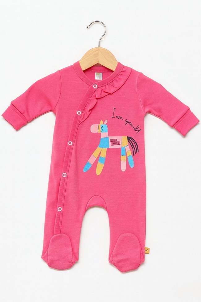 Практичното закопчаване с копчета отпред улеснява обличането и събличането, а покритите крачета поддържат бебето топло и защитено. Подходящ както за ежедневието у дома, така и за разходки.