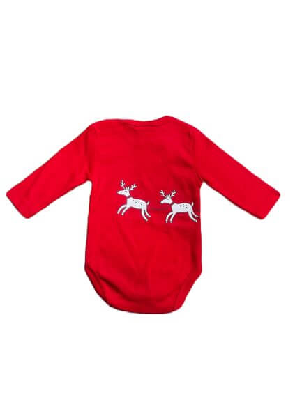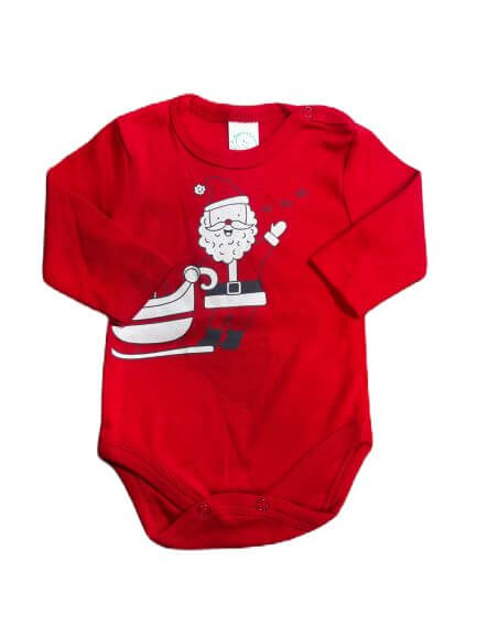 Прекрасно боди с дълъг ръкав в червено. Бодито се закопчава отдолу с две копчета. Отпред е с картинка на Дядо Коледа с шейна, а отзад с еленчета. Бодито е изработено от памучна материя.