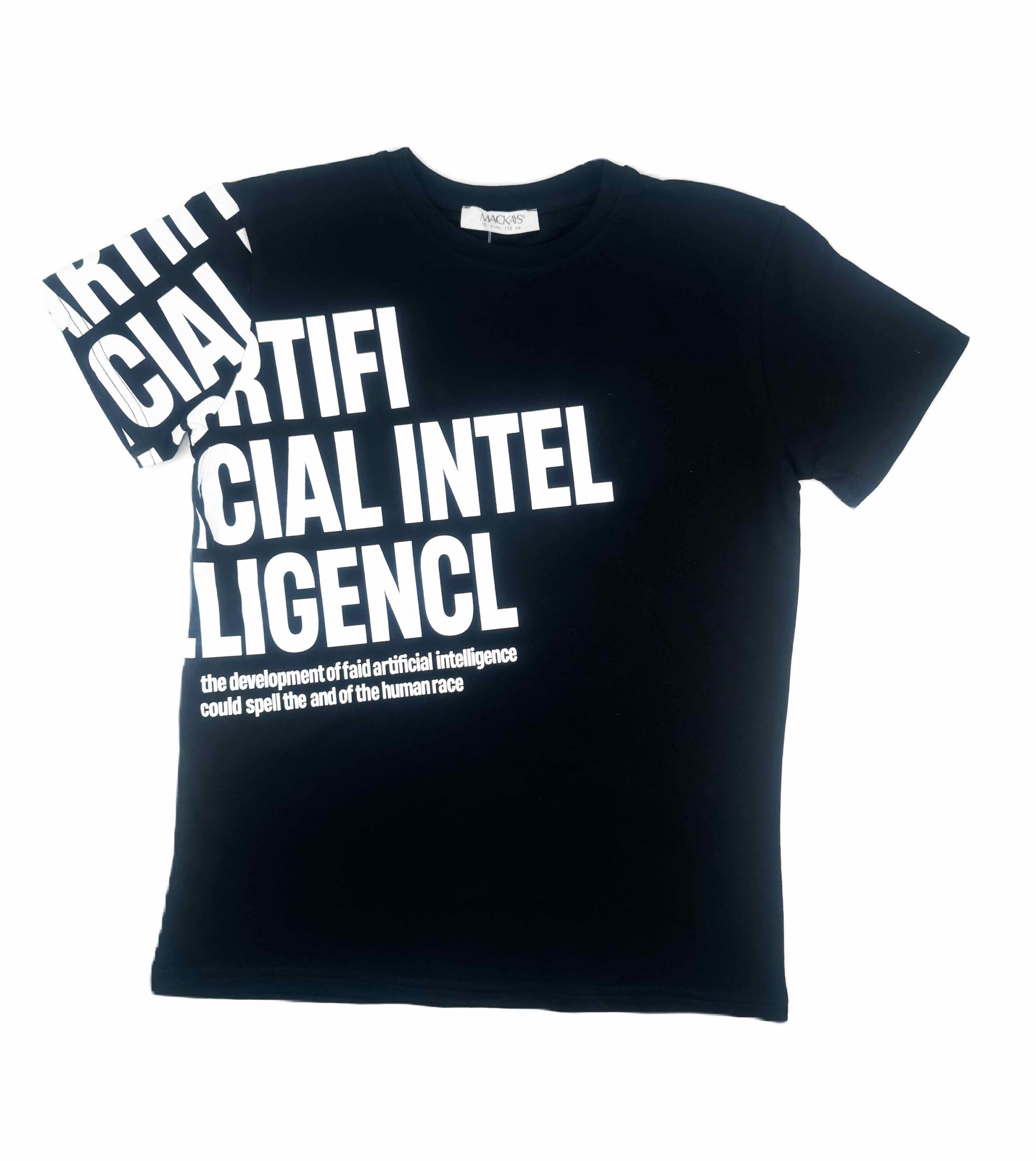 Черна тениска с надписи от MACKAYS с къс ръкав, изработена от памучна материя.