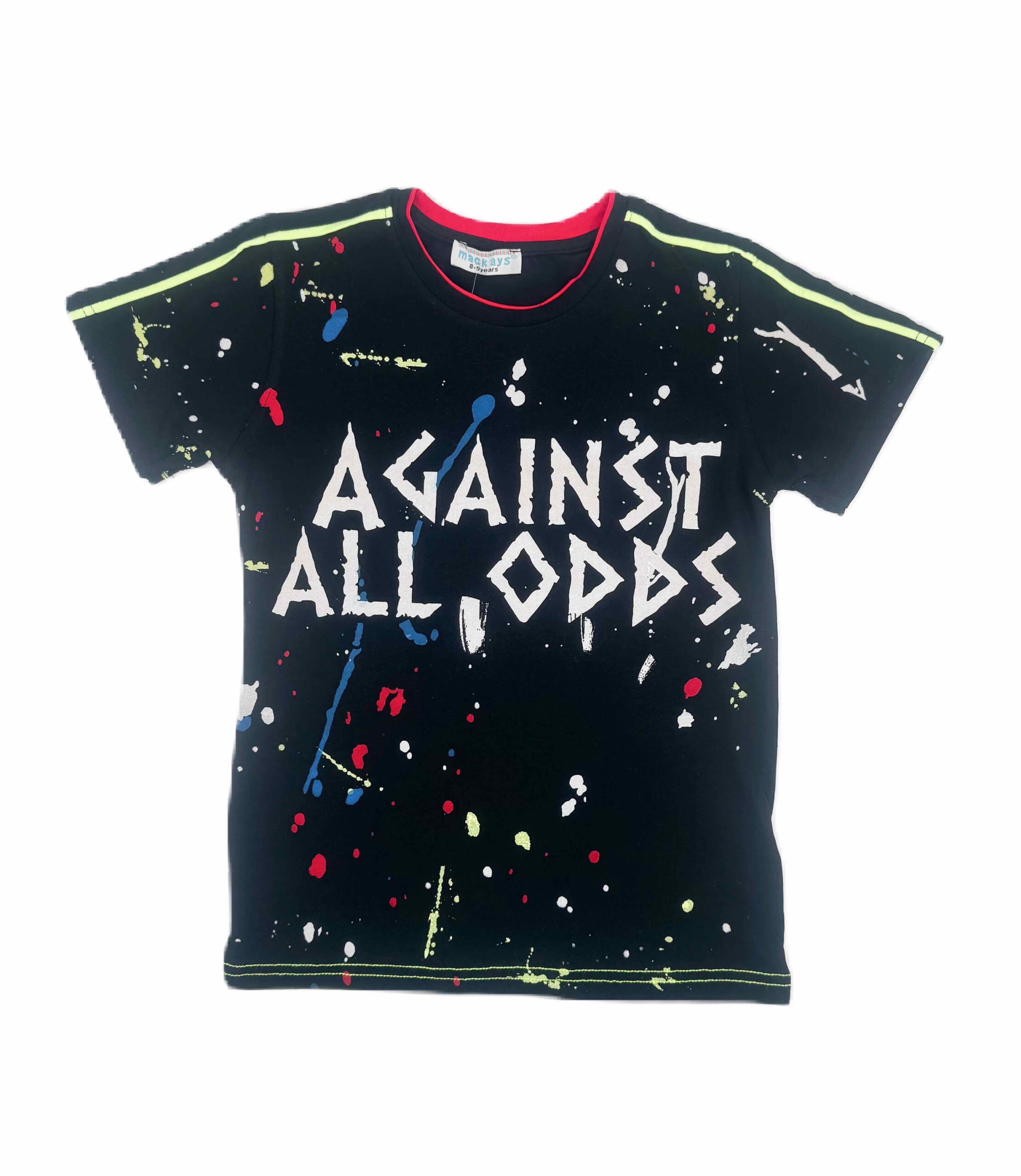 Черна тениска за момче с надписи и цветни петна. Тениска с къс ръкав, изработена от памучна материя.