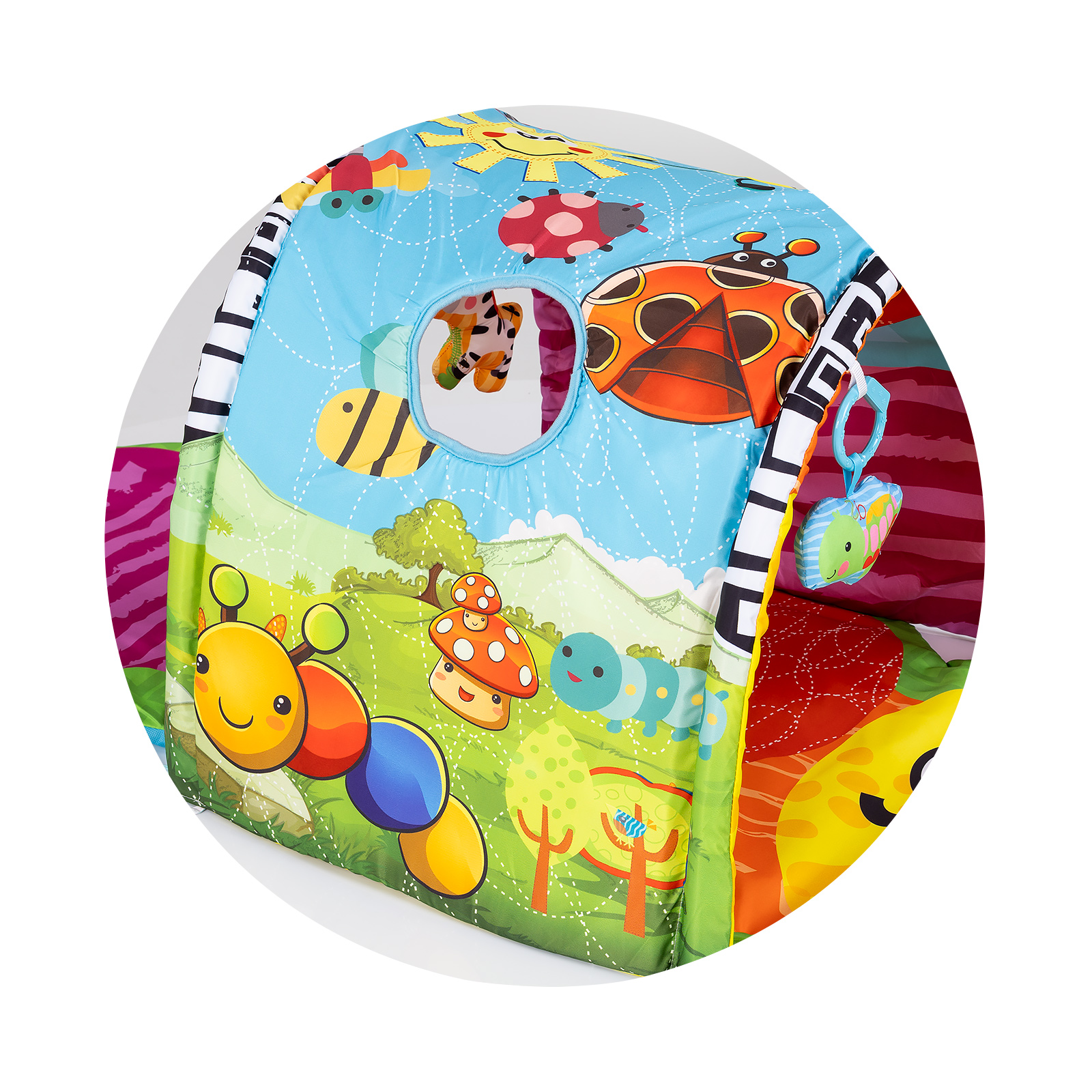 С цветни играчки и мека подложка, тази активна гимнастика насърчава развитието на сетивата и моториката. Лесна за поддръжка и подходяща от 0+ месеца, тя е верен приятел в първите откривателски игри на бебето.