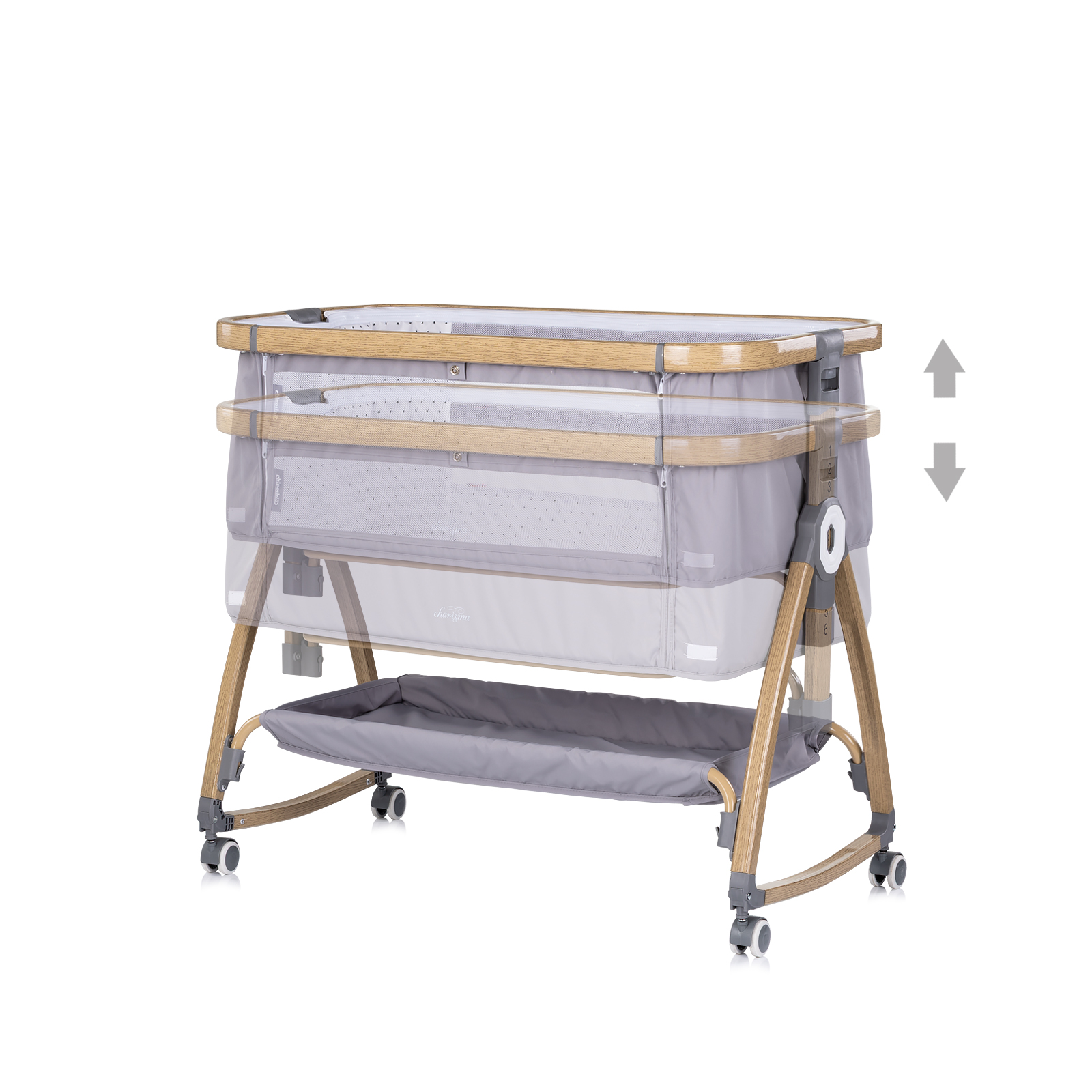 ,Co-sleeping crib with drop side “Charisma“ platinum/wood + wheels,Кош.с подв.стр.Charisma“ платина+колела