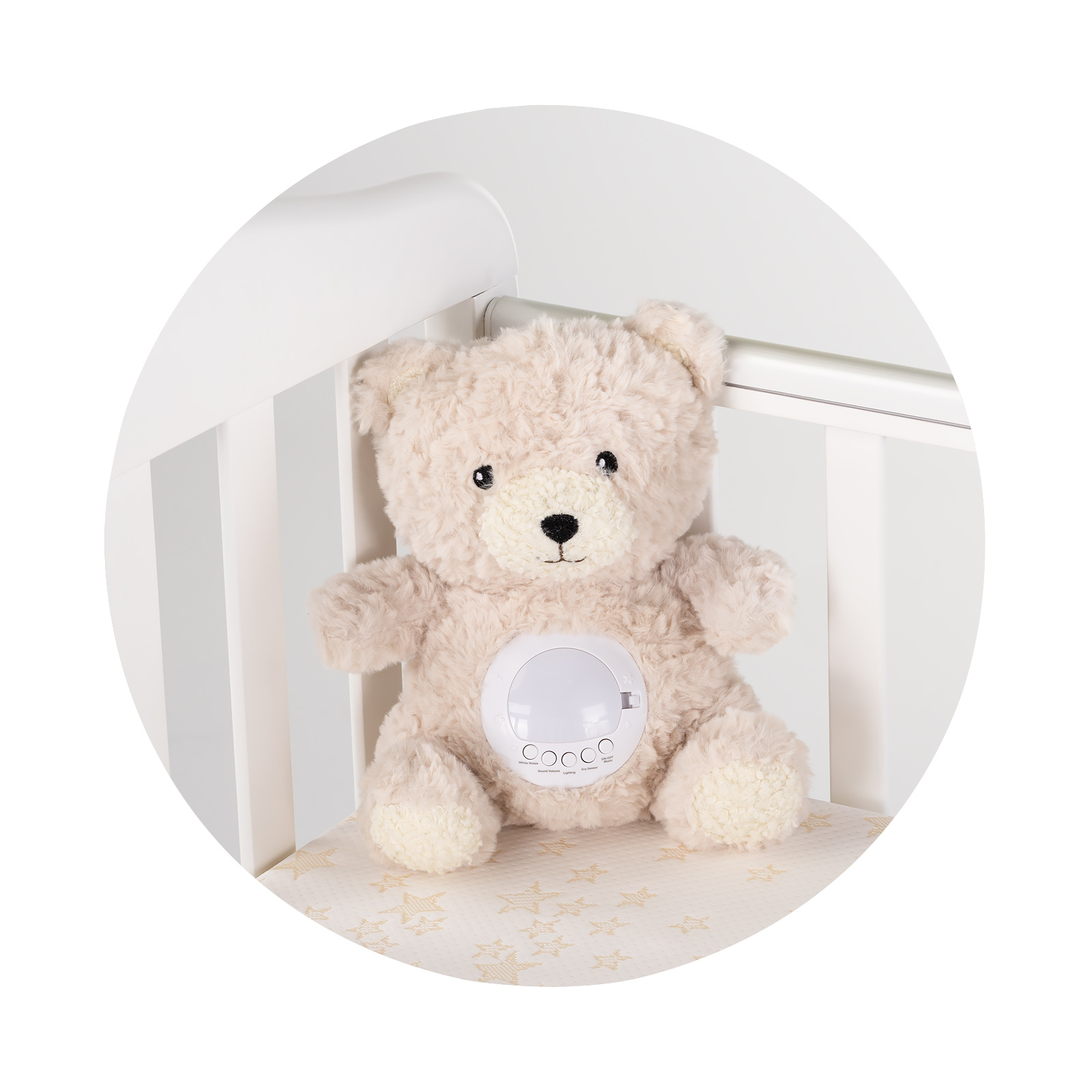 Мекото и уютно мече ще се превърне в най-добрия приятел за сън на вашето дете. Със своята вградена музикална кутия и 10 нежни приспивни мелодии, то успокоява и носи спокойствие преди сън. Благодарение на три сменяеми капака – звездно небе, нощна лампа и океан – мечето създава магическа атмосфера в детската стая.