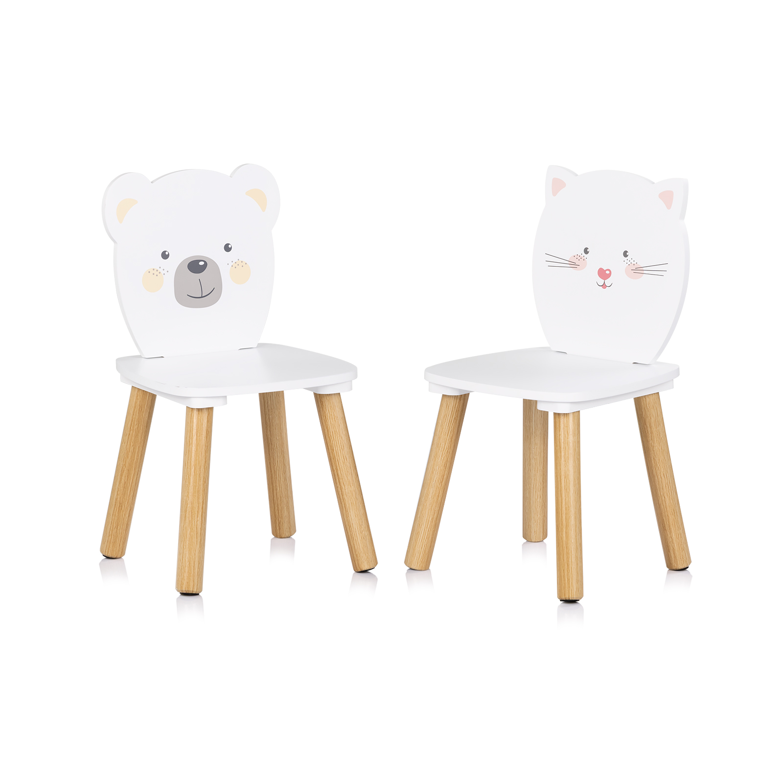 Очарователен детски комплект, състоящ се от масичка и две столчета с гърбове във формата на коте и мече. Изработен от висококачествен MDF и дърво с естествен финиш, този комплект предлага стабилност и безопасност по време на игра, рисуване или хранене. Заоблените ръбове и гладката повърхност осигуряват максимален комфорт и сигурност. Перфектно допълнение към всяка детска стая или игрална зона.