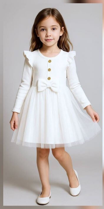 Детска бяла рокля с дълъг ръкав, тюлена пола и голяма панделка на талията.