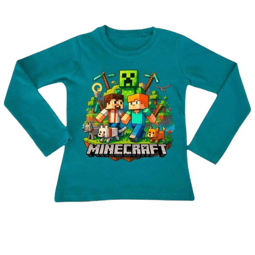 Детска цветна блуза за момче Minecraft. Модел с дълъг ръкав, обло деколте. На лицевата част има надпис и картинка на Minecraft. Изработена е от мека памучна материя с високо качество.