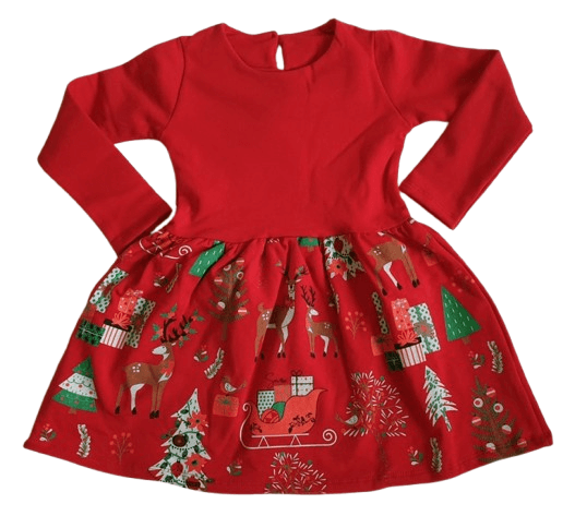 Детска коледна рокля, подходяща за зимния сезон. Изработена от мека памучна материя, с обло деколте, закопчаване с копче на гърба, разкроена долна част, дълъг ръкав и дължина до коляното. Роклята е декорирана с красив коледен десен. Моделът е подходящ за всички коледни празници.