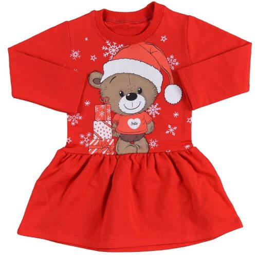 Детска коледна рокля с дълъг ръкав в червено с мече * Севтекс