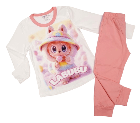 Детска пижама за момичета с Labubu ВЕНЕРА. Изработена от 100% памук. Пижамката е с дълъг ръкав и картинка на любимото Лабубу. Долнището е с широк ластик за по-голям комфорт.