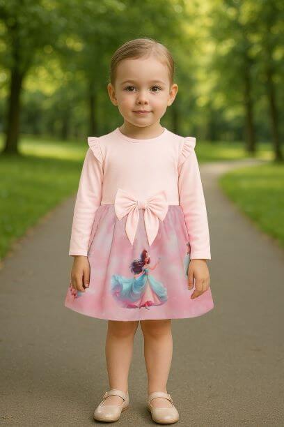 Детска рокля с дълъг ръкав в розово. В тази рокля всяко момиченце ще се чувства като истинска принцеса. Отзад има копче за по-лесно събличане и обличане. Рокличката е много подходяща за официални поводи-рожденни дни, детски балове, за сцена и други тържества.