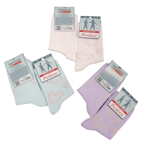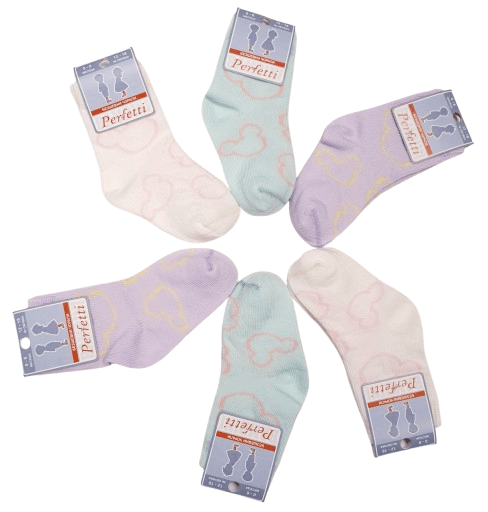 Детски чорапи за момиче на доказаната българска фирма Perfetti. Опаковани по 6 чифта в пакет от един размер.