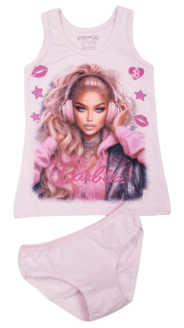Комплекта се състои от потник с широка презрамка и картинка на Барби и бикини. Материята е изключително мека и приятна.