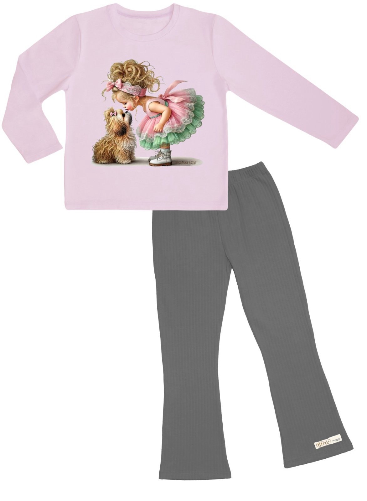 Детски комплект за момиче. Блузката е с картинка на момиче и куче. Изработен от меки и еластични материали.