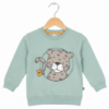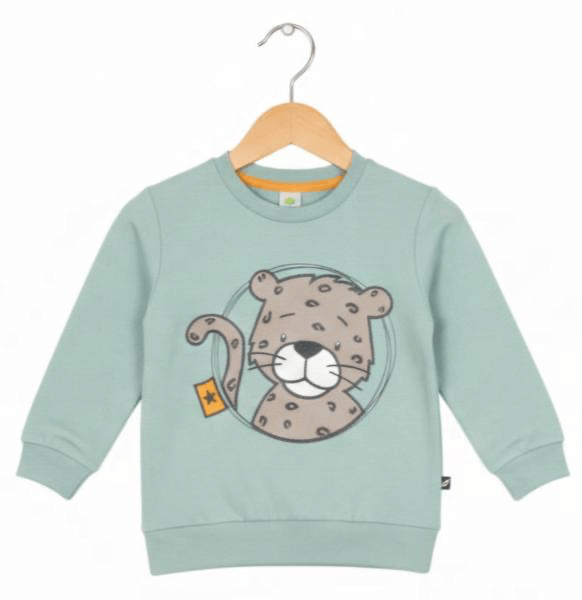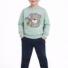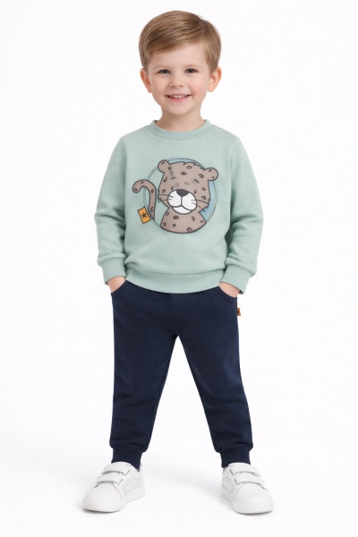 Детски спортен комплект Leopard Rach. Той се състои от блуза в цвят мента с принт на леопард и тъмносини панталони.