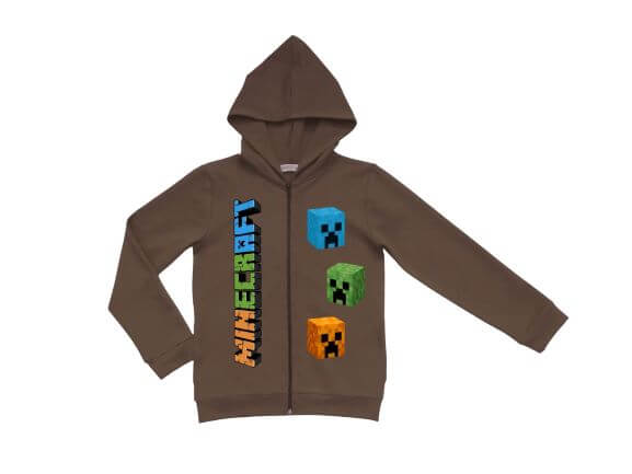 Детски суитшърт с качулка в кафяв цвят с Minecraft на Мариела. Има надпис и картинки на Майнкрафт и две джобчета без цип. Материята е памук и еластан.