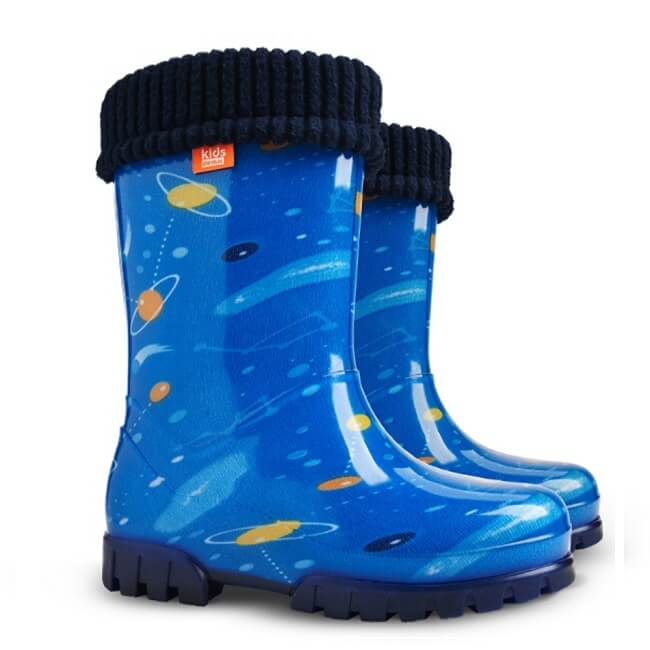 Гумени ботуши с топъл чорап *Космос* DEMAR. Те са изключително здрави и са със сдвоени номера за по-дълга употреба. Гумените ботуши са с топло подвижно чорапче, което може да се отстрани по всяко време. Когато ботушките започнат да омаляват на вашето дете, извадете чорапчето и то ще може да ги носи още известно време. Имат олекотено и еластично ходило, против проникване на вода, сняг или киша. По тях има светло-отразителни елементи. WATERPROOF – не пропускат вода!