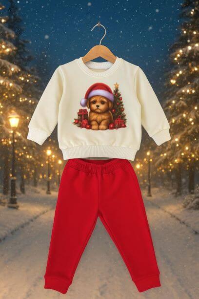 Коледен детски комплект в червено и бяло с кученце