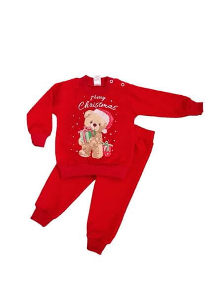 Блузка и панталон в червено със сладко мече и коледен надпис.