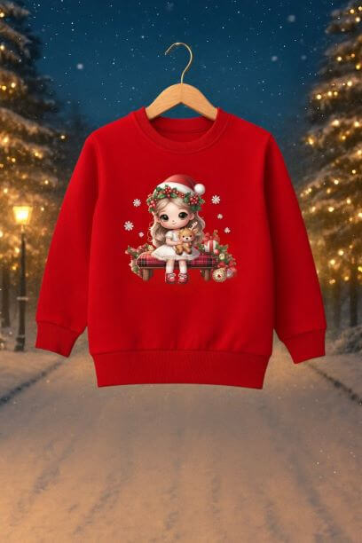 Детска коледна блуза в червено с дълъг ръкав и лека вата. С весела картинка на момиче. Блузата е подходяща за Коледа и Нова гдина, а също така и за коледни тържества в училища и детски градини.