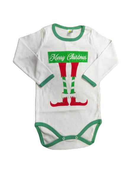 Коледно бебешко боди с дълъг ръкав с надпис Merry Chtistmas в бяло и зелено *Rach