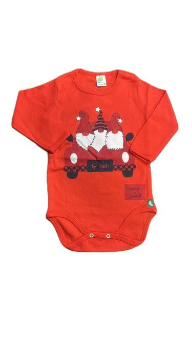 Коледно боди с Джуджета на Rach в червен цвят. Има картинка на три джуджета отпред. Памучна материя.