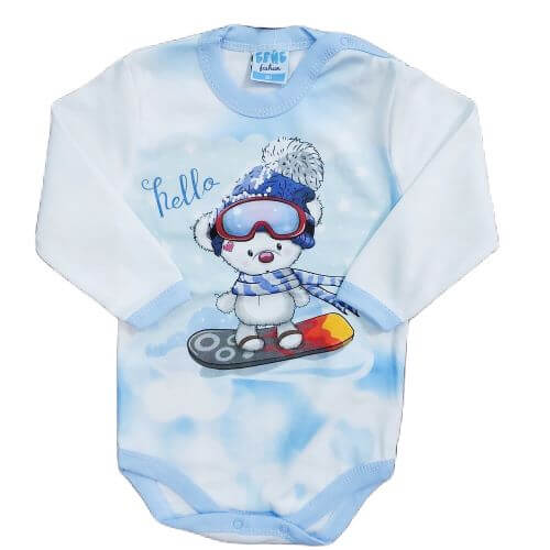 Коледно бебешко боди с мече и сноуборд. Нашите коледни дрехи за бебета са български и със състав 100% памук. Имате голям избор и от другите ни коледни комплекти и бодита с надпис и картинка. Разполагаме с модели за момчета и момичета – роклички и костюмчета. Комбинирали сме цветовете и дизайните на дрешките в духа на коледните празници. Страхотен избор за предстоящата Ви коледна фотосесия. С нашите разнообразни коледни дизайни ще намерите какво да сложите под елхата в навечерието на Бъдни вечер.