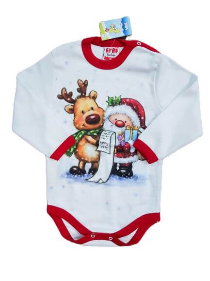 Коледно боди Дядо Коледа и еленче бяло. Състав: 100% памук. Произведено в България с любов за вашето бебче.